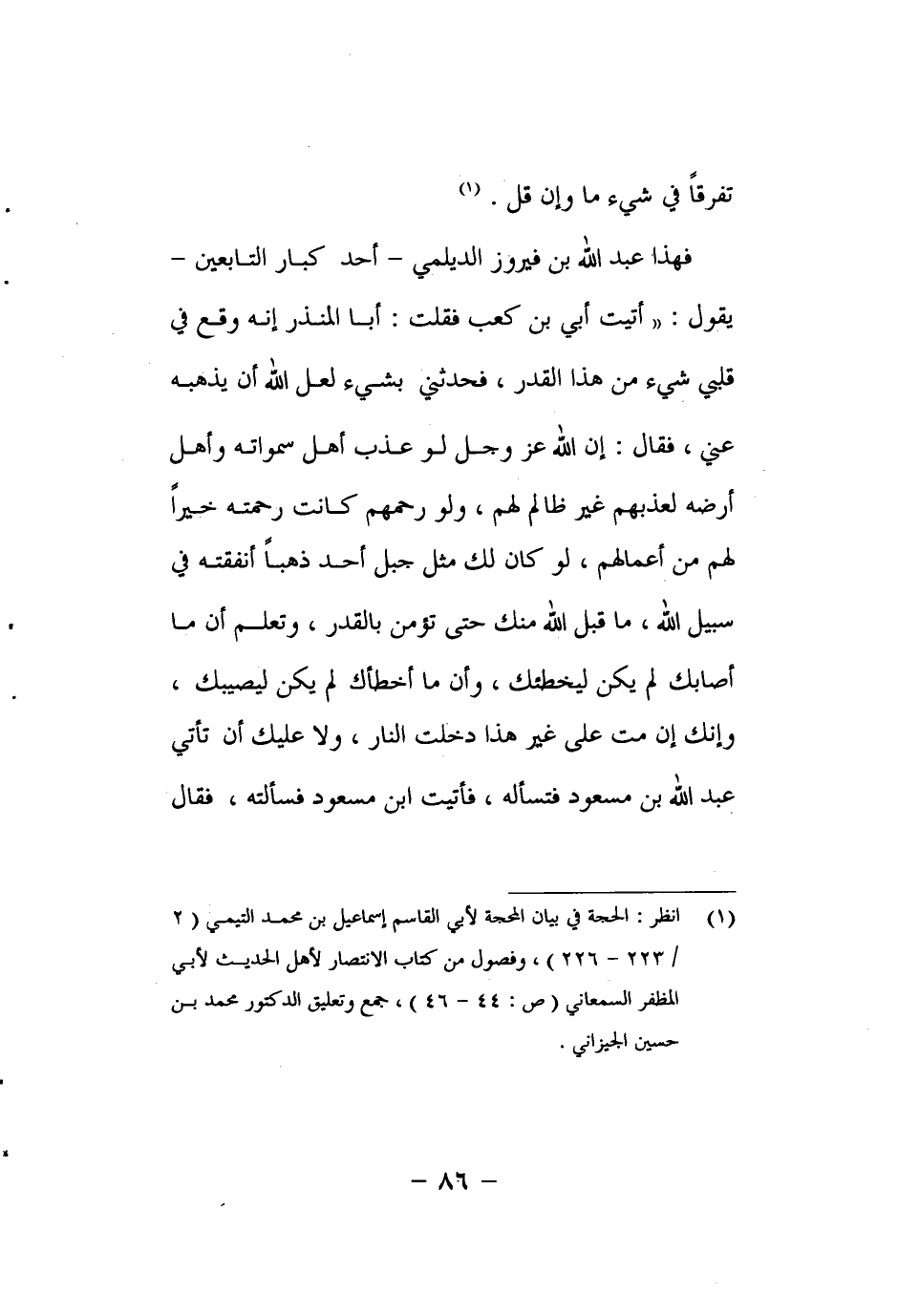 فهذا عبد الله بن فيروز الديلمي - أحد كبار التابعين - يقول: "أتيت أبي بن كعب فقلت: أبا المنذر إنه وقع في قلبي شيء من هذا القدر، فحدثني بشيء لعل الله أن يذهبه عني، فقال: إن الله عز وجل لو عذب أهل سمواته وأهل أرضه لعذبهم غير ظالم لهم، ولو رحمهم كانت رحمته خيراً لهم من أعمالهم، لو كان لك مثل جبل أحد ذهباً أنفقته في سبيل الله، ما قبل الله منك حتى تؤمن بالقدر، وتعلم أن ما أصابك لم يكن ليخطئك، وأن ما أخطأك لم يكن ليصيبك، وإنك إن مت على غير هذا دخلت النار، ولا عليك أن تأتي عبد الله بن مسعود فتسأله، فأتيت ابن مسعود فسألته، فقال