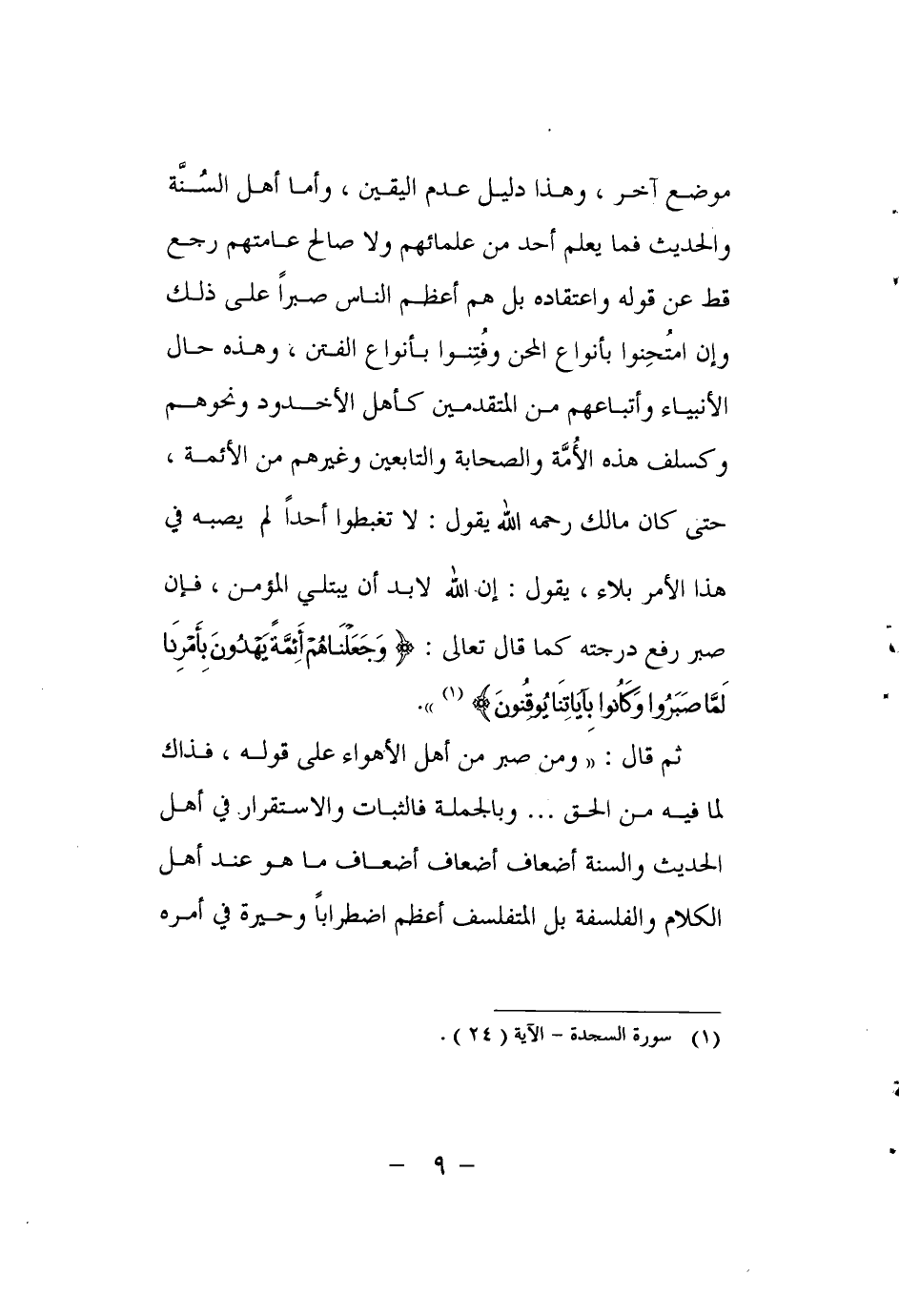 موضع آخر، وهذا دليل عدم اليقين، وأما أهل السُنَّة والحديث فما يعلم أحد من علمائهم ولا صالح عامتهم رجع قط عن قوله واعتقاده بل هم أعظم الناس صبراً على ذلك وإن امتُحِنوا بأنواع المحن وفُتِنوا بأنواع الفتن، وهذه حال الأنبياء وأتباعهم من المتقدمين كأهل الأخدود ونحوهم وكسلف هذه الأُمَّة والصحابة والتابعين وغيرهم من الأئمة، حتى كان مالك رحمه الله يقول: لا تغبطوا أحداً لم يصبه في هذا الأمر بلاء، يقول: إن الله لابد أن يبتلي المؤمن، فإن صبر رفع درجته كما قال تعالى: {وَجَعَلْنَاهُمْ أَئِمَّةً يَهْدُونَ بِأَمْرِنَا لَمَّا صَبَرُوا وَكَانُوا بِآيَاتِنَا يُوقِنُونَ} 1".