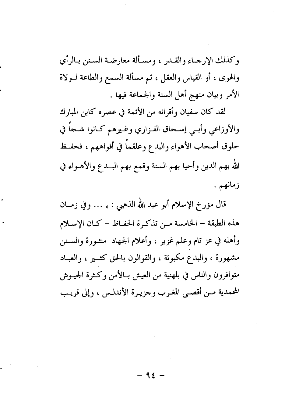 وكذلك الإرجاء والقدر، ومسألة معارضة السنن بالرأي والهوى، أو القياس والعقل، ثم مسألة السمع والطاعة لولاة الأمر وبيان منهج أهل السنة والجماعة فيها.