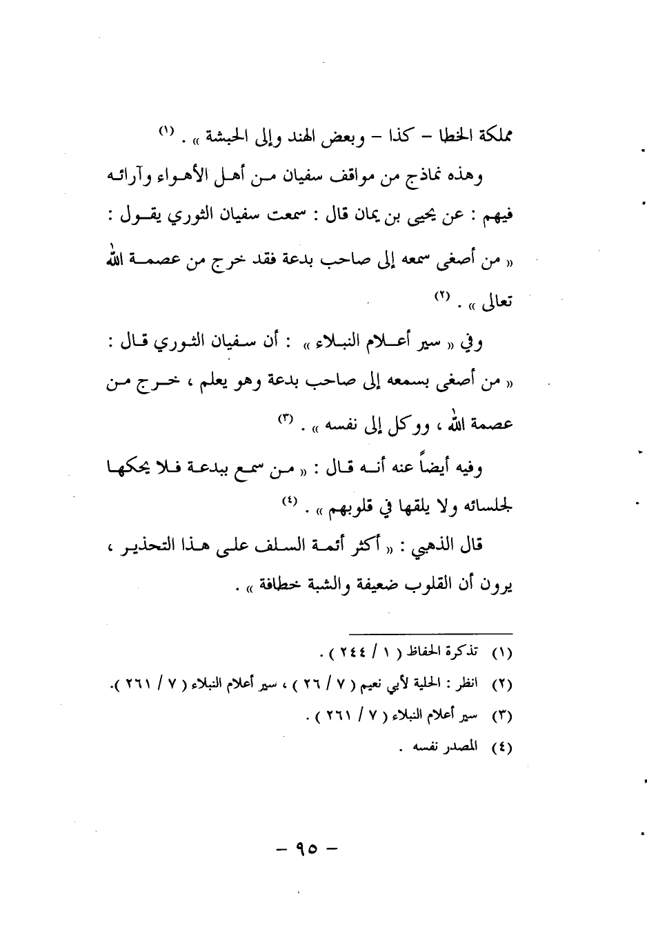 وفي "سير أعلام النبلاء": أن سفيان الثوري قال: "من أصغى بسمعه إلى صاحب بدعة وهو يعلم، خرج من عصمة الله، ووكل إلى نفسه". 3