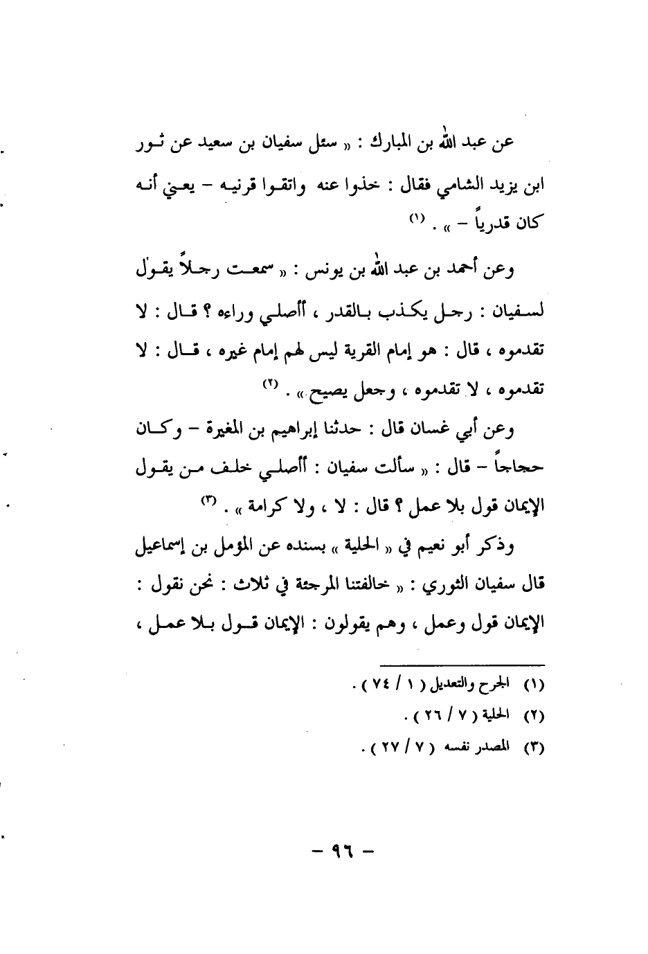 وذكر أبو نعيم في "الحلية" بسنده عن المؤمل بن إسماعيل قال سفيان الثوري: "خالفتنا المرجئة في ثلاث: نحن نقول: الإيمان قول وعمل، وهم يقولون: الإيمان قول بلا عمل،