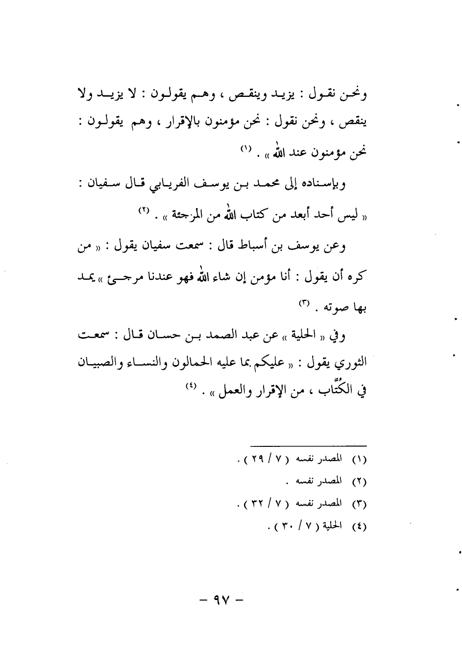 وعن يوسف بن أسباط قال: سمعت سفيان يقول: "من كره أن يقول: أنا مؤمن إن شاء الله فهو عندنا مرجئ" يمد بها صوته. 3