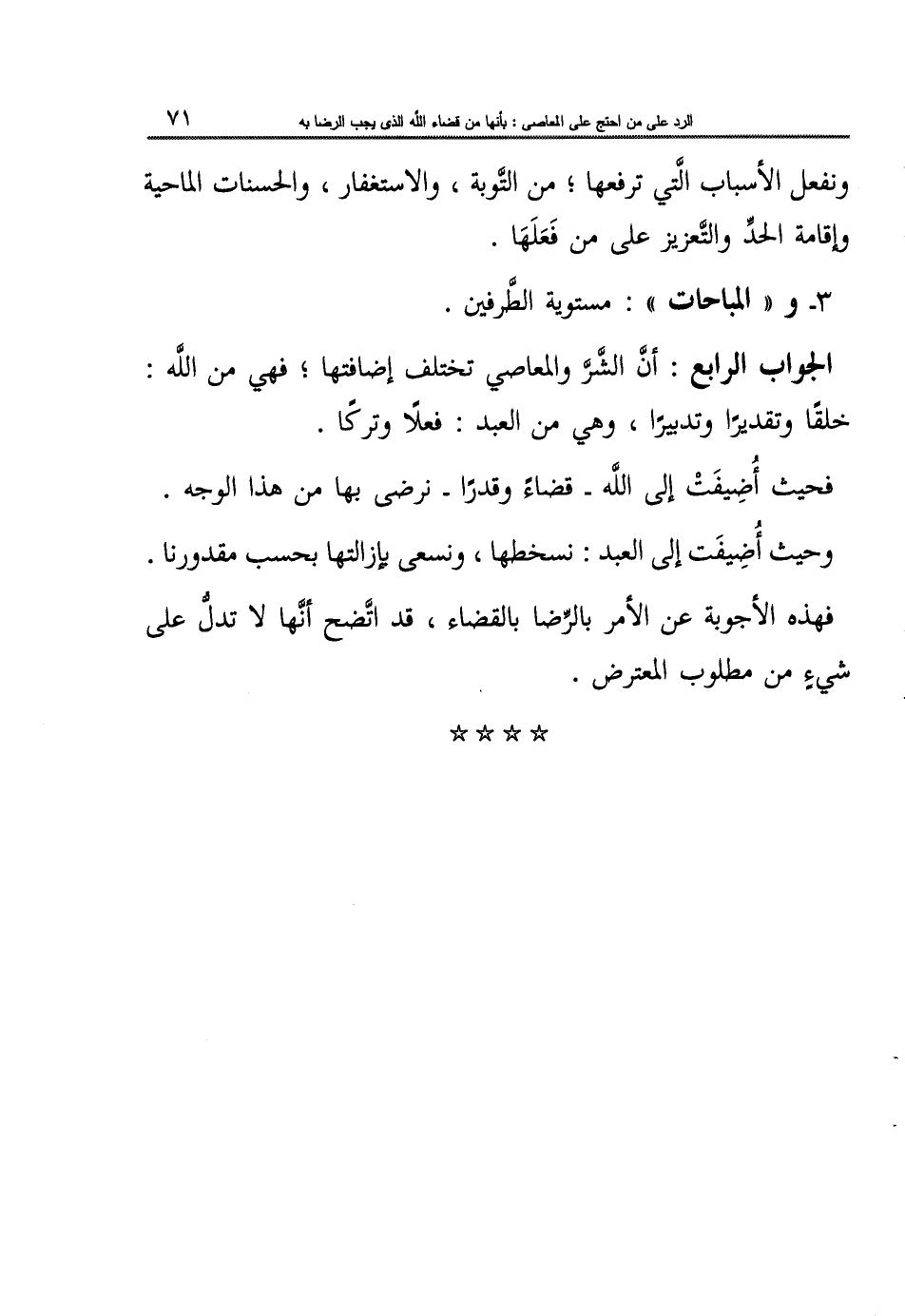 فهذه الأجوبة عن الأمر بالرضا بالقضاء، قد اتضح أنها لا تدل على شيء من مطلوب المعترض.