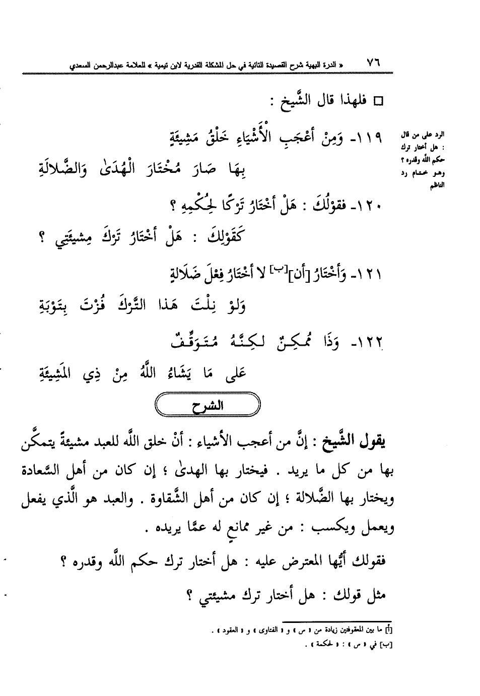 يقول الشيخ: إن من أعجب الأشياء: أن خلق الله للعبد مشيئة يتمكن بها من كل ما يريد. فيختار بها الهدى، إن كان من أهل السعادة ويختار بها الضلالة، إن كان من أهل الشقاوة. والعبد هو الذي يفعل ويعمل ويكسب: من غير ممانع له عما يريده.