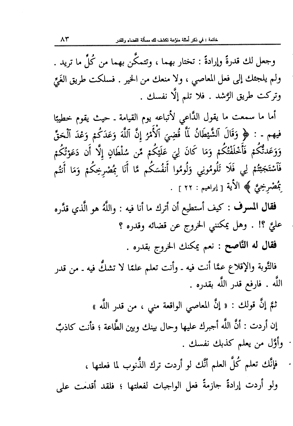 فقال المسرف: كيف أستطيع أن أترك ما أنا فيه: والله هو الذي قدره علي؟!. وهل يمكنني الخروج عن قضائه وقدره؟