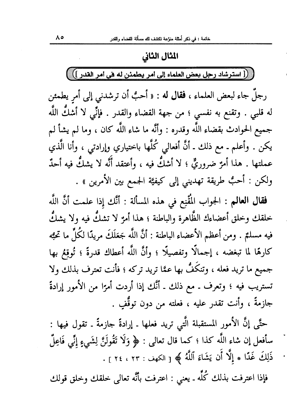 رجل جاء لبعض العلماء، فقال له:"أحب أن ترشدني إلى أمر يطمئن له قلبي. وتقنع به نفسي، من جهة القضاء والقدر. فإني لا أشك الله جميع الحوادث بقضاء الله وقدره: وأنه ما شاء الله كان، وما لم يشأ لم يكن. وأعلم مع ذلك أن أفعالي كلها باختياري وإرادتي، وأنا الذي عملتها. هذا أمر ضروري، لاشك فيه، وأعتقد أنه لا يشك فيه أحد ولكن: أحب طريقة تهديني إلى كيفية الجمع بين الأمرين".