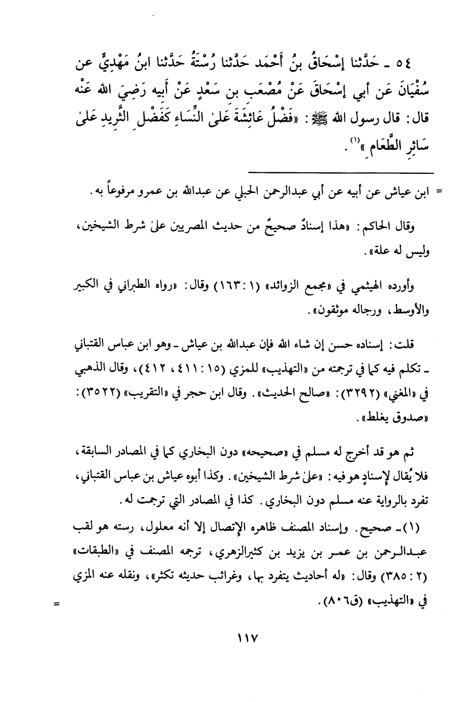 54 - حَدَّثَنَا إِسْحَاقُ بْنُ أَحْمَدَ , حَدَّثَنَا رُسْتَةُ , حَدَّثَنَا ابْنُ مَهْدِيٍّ , عَنْ سُفْيَانَ , عَنْ أَبِي إِسْحَاقَ , عَنْ مُصْعَبِ بْنِ سَعْدٍ , عَنْ أَبِيهِ رَضِيَ اللَّهُ عَنْهُ قَالَ: قَالَ رَسُولُ اللَّهِ صَلَّى اللهُ عَلَيْهِ وَسَلَّمَ: §«فَضْلُ عَائِشَةَ عَلَى النِّسَاءِ كَفَضْلِ الثَّرِيدِ عَلَى سَائِرِ الطَّعَامِ»