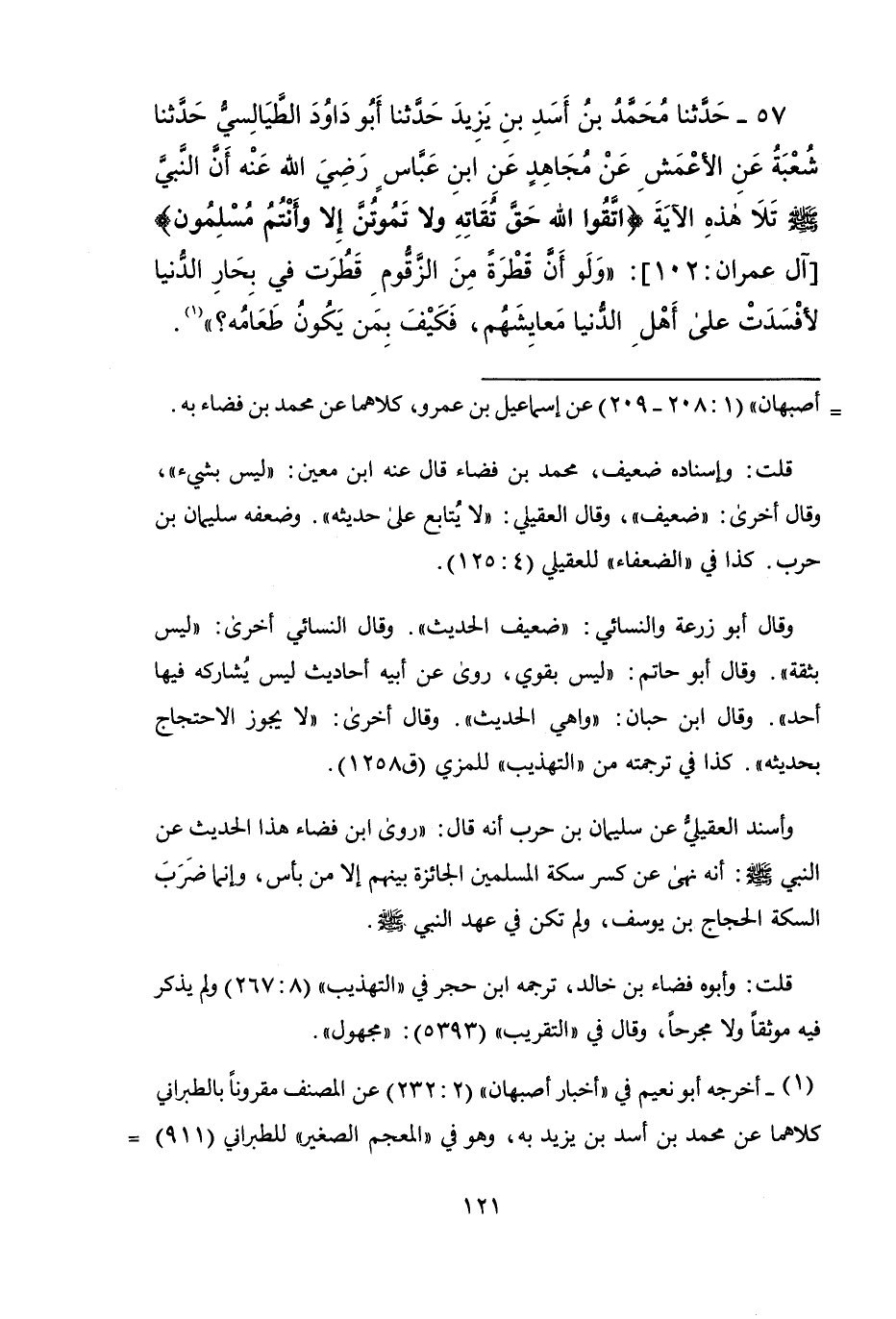 57 - حَدَّثَنَا مُحَمَّدُ بْنُ أَسَدِ بْنِ يَزِيدَ , حَدَّثَنَا أَبُو دَاوُدَ الطَّيَالِسِيُّ , حَدَّثَنَا شُعْبَةُ , عَنِ الْأَعْمَشِ , عَنْ مُجَاهِدٍ , عَنِ ابْنِ عَبَّاسٍ رَضِيَ اللَّهُ عَنْهُ أَنَّ النَّبِيَّ صَلَّى اللهُ عَلَيْهِ وَسَلَّمَ تَلَا هَذِهِ الْآيَةَ: " {اتَّقُوا اللَّهَ حَقَّ تُقَاتِهِ وَلَا تَمُوتُنَّ إِلَّا وَأَنْتُمْ مُسْلِمُونَ} [آل عمران: 102] §وَلَوْ أَنَّ قَطْرَةً مِنَ الزَّقُّومِ قُطِرَتْ فِي بِحَارِ الدُّنْيَا لَأَفْسَدَتْ عَلَى أَهْلِ الدُّنْيَا مَعَايِشَهُمْ , فَكَيْفَ بِمَنْ يَكُونُ طَعَامَهُ؟ "