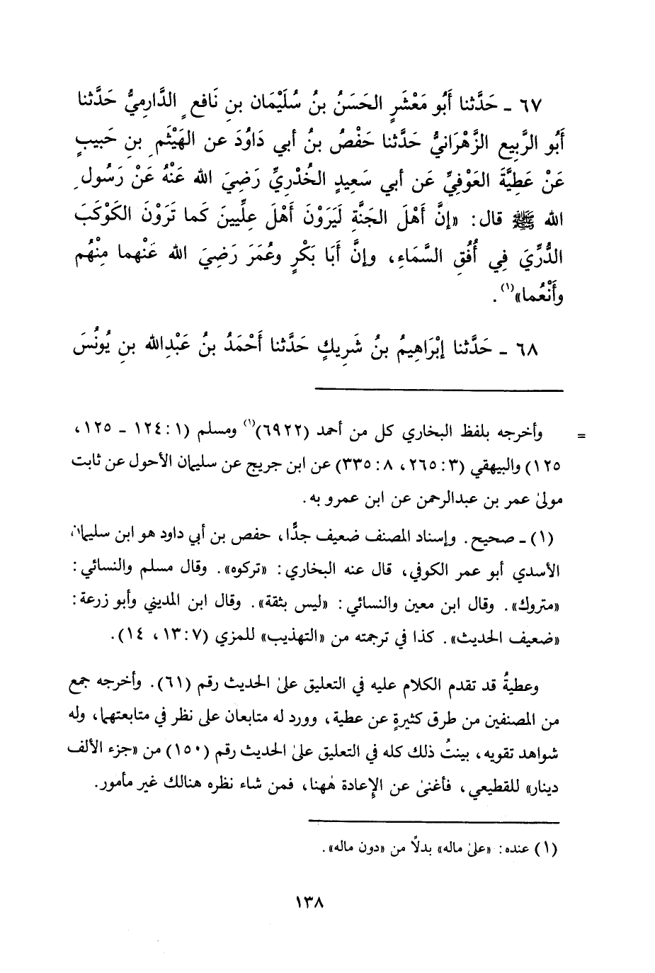67 - حَدَّثَنَا أَبُو مَعْشَرٍ الْحَسَنُ بْنُ سُلَيْمَانَ بْنِ نَافِعٍ الدَّارِمِيُّ , حَدَّثَنَا أَبُو الرَّبِيعِ الزَّهْرَانِيُّ , حَدَّثَنَا حَفْصُ بْنُ أَبِي دَاوُدَ , عَنِ الْهَيْثَمِ بْنِ حَبِيبٍ , عَنْ عَطِيَّةَ الْعَوْفِيِّ , عَنْ أَبِي سَعِيدٍ الْخُدْرِيِّ رَضِيَ اللَّهُ عَنْهُ , عَنْ رَسُولِ اللَّهِ صَلَّى اللهُ عَلَيْهِ وَسَلَّمَ قَالَ: «إِنَّ §أَهْلَ الْجَنَّةِ لَيَرَوْنَ أَهْلَ عِلِّيِّينَ , كَمَا تَرَوْنَ الْكَوْكَبَ الدُّرِّيَّ فِي أُفُقِ السَّمَاءِ , وَإِنَّ أَبَا بَكْرٍ وَعُمَرَ رَضِيَ اللَّهُ عَنْهُمَا مِنْهُمْ , وَأَنْعَمَا»