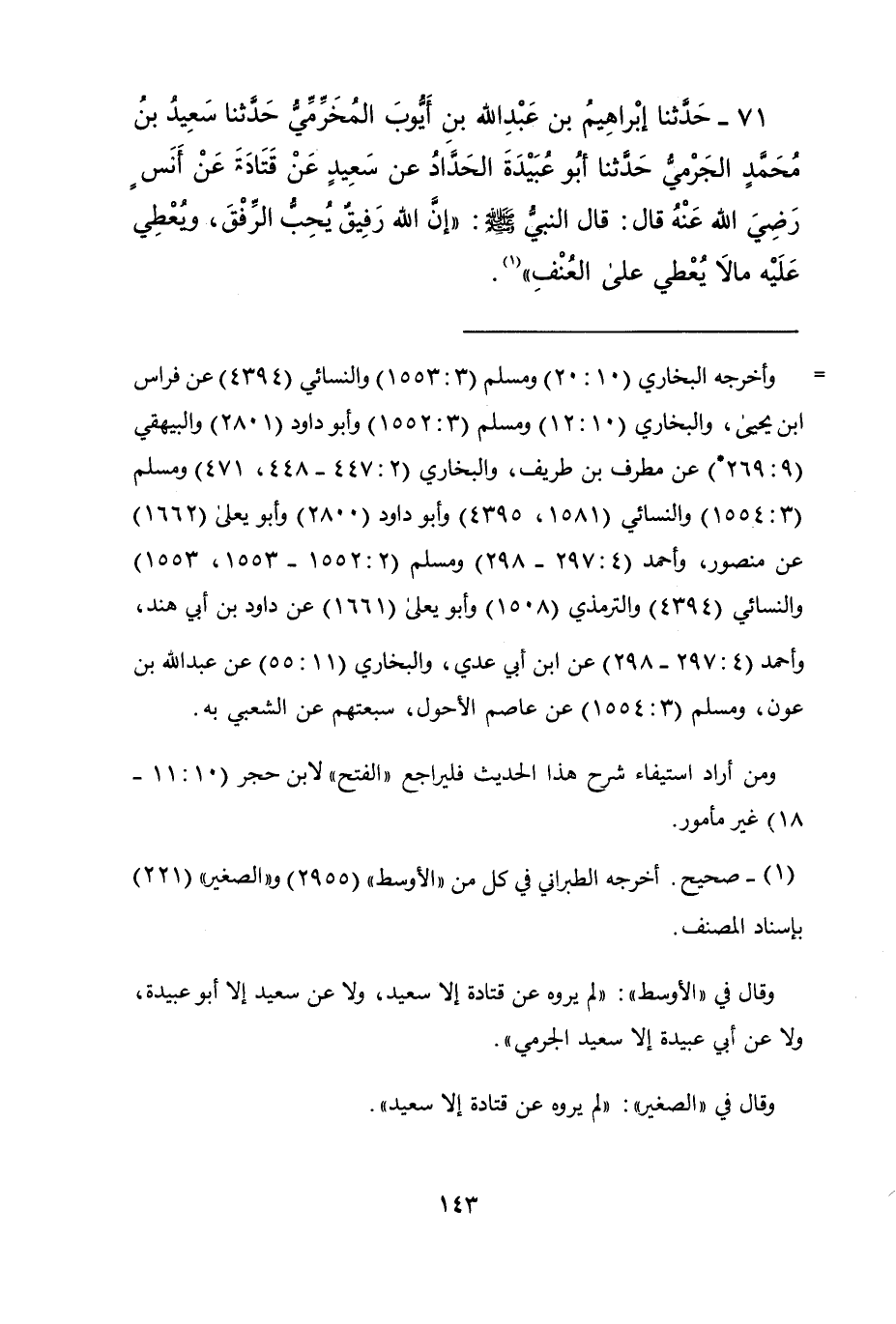 71 - حَدَّثَنَا إِبْرَاهِيمُ بْنُ عَبْدِ اللَّهِ بْنِ أَيُّوبَ الْمُخَرِّمِيُّ , حَدَّثَنَا سَعِيدُ بْنُ مُحَمَّدٍ الْجَرْمِيُّ , حَدَّثَنَا أَبُو عُبَيْدَةَ الْحَدَّادُ , عَنْ سَعِيدٍ , عَنْ قَتَادَةَ , عَنْ أَنَسٍ رَضِيَ اللَّهُ عَنْهُ قَالَ: قَالَ النَّبِيُّ صَلَّى اللهُ عَلَيْهِ وَسَلَّمَ: «إِنَّ §اللَّهَ رَفِيقٌ يُحِبُّ الرِّفْقَ , وَيُعْطِي عَلَيْهِ مَا لَا يُعْطِي عَلَى الْعُنْفِ»