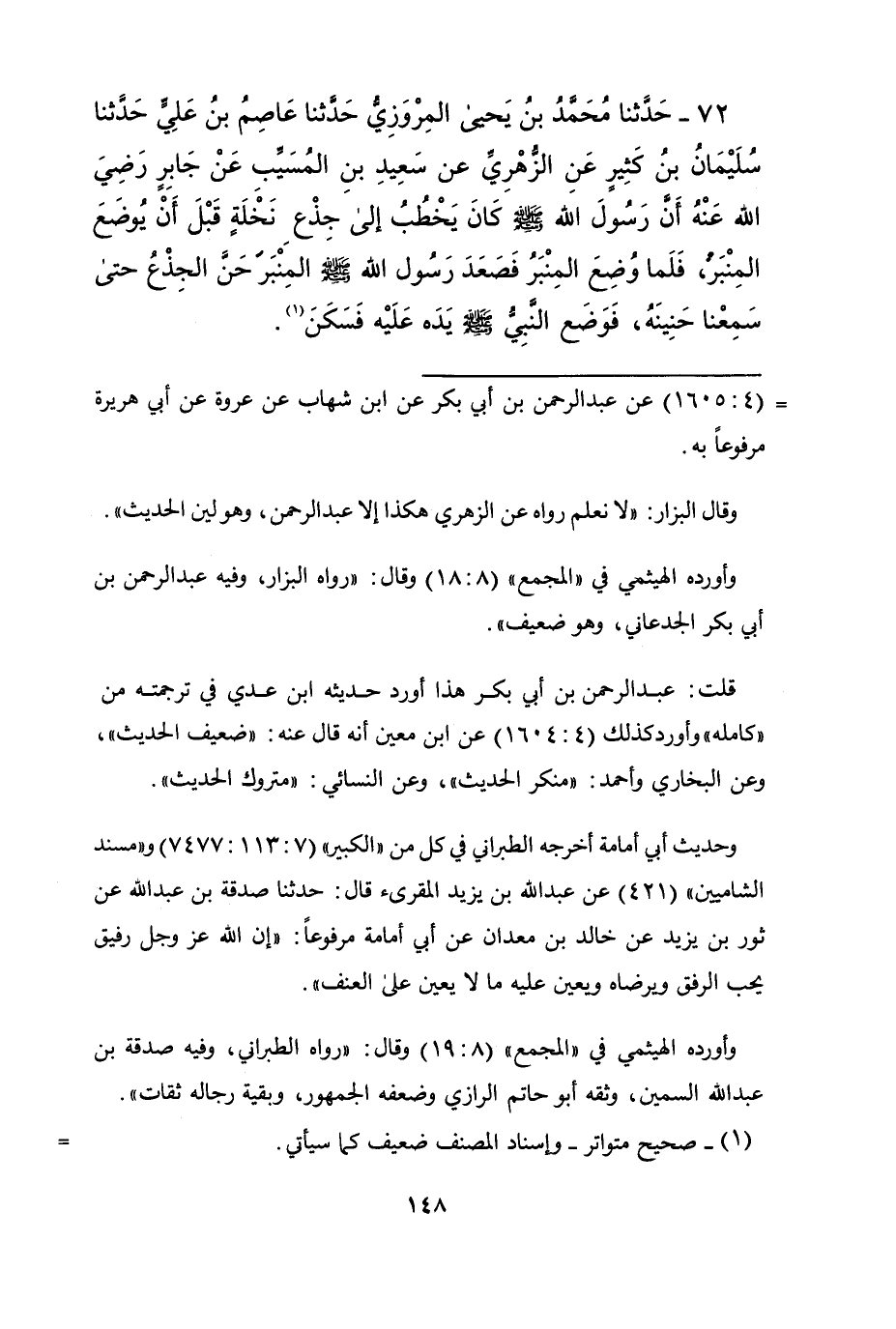 72 - حَدَّثَنَا مُحَمَّدُ بْنُ يَحْيَى الْمَرْوَزِيُّ , حَدَّثَنَا عَاصِمُ بْنُ عَلِيٍّ , حَدَّثَنَا سُلَيْمَانُ بْنُ كَثِيرٍ , عَنِ الزُّهْرِيِّ , عَنْ سَعِيدِ بْنِ الْمُسَيِّبِ , عَنْ جَابِرٍ رَضِيَ اللَّهُ عَنْهُ أَنَّ رَسُولَ اللَّهِ صَلَّى اللهُ عَلَيْهِ وَسَلَّمَ «كَانَ يَخْطُبُ إِلَى جِذْعِ نَخْلَةٍ قَبْلَ أَنْ يُوضَعَ الْمِنْبَرُ , فَلَمَّا وُضِعَ الْمِنْبَرُ فَصَعِدَ رَسُولُ اللَّهِ صَلَّى اللهُ عَلَيْهِ وَسَلَّمَ الْمِنْبَرَ , §حَنَّ الْجِذْعُ حَتَّى سَمِعْنَا حَنِينَهُ , فَوَضَعَ النَّبِيُّ صَلَّى اللهُ عَلَيْهِ وَسَلَّمَ يَدَهُ عَلَيْهِ فَسَكَنَ» .
