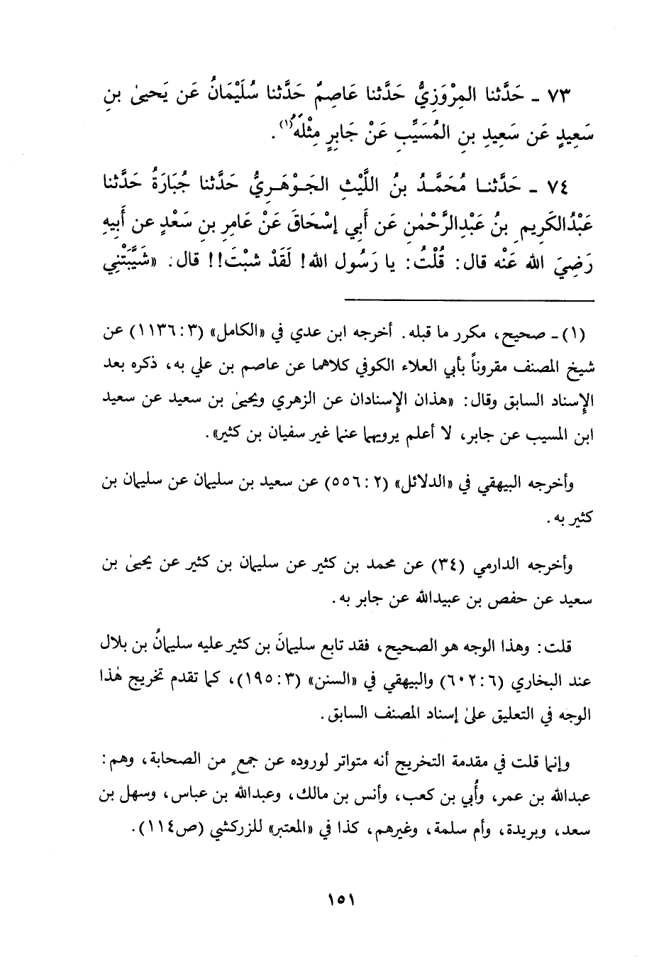 74 - حَدَّثَنَا مُحَمَّدُ بْنُ اللَّيْثِ الْجَوْهَرِيُّ , حَدَّثَنَا جُبَارَةُ , حَدَّثَنَا عَبْدُ الْكَرِيمِ بْنُ عَبْدِ الرَّحْمَنِ , عَنْ أَبِي إِسْحَاقَ , عَنْ عَامِرِ بْنِ سَعْدٍ , عَنْ أَبِيهِ رَضِيَ اللَّهُ عَنْهُ قَالَ: قُلْتُ: يَا رَسُولَ اللَّهِ , لَقَدْ شِبْتَ قَالَ: §«شَيَّبَتْنِي هُودٌ , وَالْوَاقِعَةُ , وَعَمَّ يَتَسَاءَلُونَ , وَإِذَا الشَّمْسُ كُوِّرَتْ»