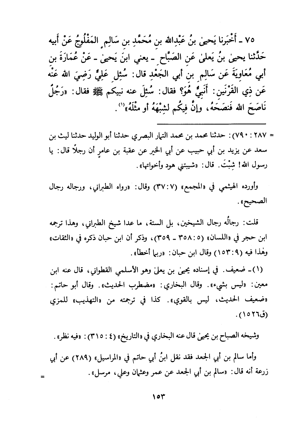 75 - أَخْبَرَنَا يَحْيَى بْنُ عَبْدِ اللَّهِ بْنِ مُحَمَّدِ بْنِ سَالِمٍ الْمَفْلُوجُ , عَنْ أَبِيهِ , حَدَّثَنَا يَحْيَى بْنُ يَعْلَى , عَنِ الصَّبَّاحِ - يَعْنِي ابْنَ يَحْيَى - عَنْ عُمَارَةَ بْنِ أَبِي مُعَاوِيَةَ , عَنْ سَالِمِ بْنِ أَبِي الْجَعْدِ , قَالَ: سُئِلَ عَلِيٌّ رَضِيَ اللَّهُ عَنْهُ عَنْ ذِي الْقَرْنَيْنِ: أَنَبِيٌّ هُوَ؟ فَقَالَ: سُئِلَ عَنْهُ نَبِيُّكُمْ صَلَّى اللهُ عَلَيْهِ وَسَلَّمَ , فَقَالَ: §«رَجُلٌ نَاصَحَ اللَّهَ فَنَصَحَهُ , وَإِنَّ فِيكُمْ لَشِبْهَهُ أَوْ مِثْلَهُ»