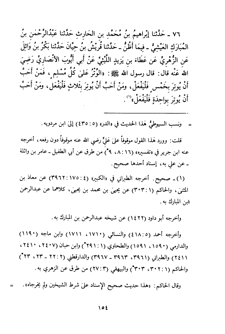 76 - حَدَّثَنَا إِبْرَاهِيمُ بْنُ مُحَمَّدِ بْنِ الْحَارِثِ , حَدَّثَنَا عَبْدُ الرَّحْمَنِ بْنُ الْمُبَارَكِ الْعَيْشِيُّ - فِيمَا أَظُنُّ - حَدَّثَنَا قُرَيْشُ بْنُ حَيَّانَ , حَدَّثَنَا بَكْرُ بْنُ وَائِلٍ , عَنِ الزُّهْرِيِّ , عَنْ عَطَاءِ بْنِ يَزِيدَ اللَّيْثِيِّ , عَنْ أَبِي أَيُّوبَ الْأَنْصَارِيِّ رَضِيَ اللَّهُ عَنْهُ قَالَ: قَالَ رَسُولُ اللَّهِ صَلَّى اللهُ عَلَيْهِ وَسَلَّمَ: §«الْوِتْرُ عَلَى كُلِّ مُسْلِمٍ , فَمَنْ أَحَبَّ أَنْ يُوتِرَ بِخَمْسٍ فَلْيَفْعَلْ , وَمَنْ أَحَبَّ أَنْ يُوتِرَ بِثَلَاثٍ فَلْيَفْعَلْ , وَمَنْ أَحَبَّ أَنْ يُوتِرَ بِوَاحِدَةٍ فَلْيَفْعَلْ»