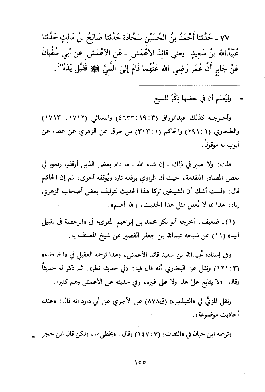 77 - حَدَّثَنَا أَحْمَدُ بْنُ الْحُسَيْنِ سَجَّادَةُ , حَدَّثَنَا صَالِحُ بْنُ مَالِكٍ , حَدَّثَنَا عُبَيْدُ اللَّهِ بْنُ سَعِيدٍ - يَعْنِي قَائِدَ الْأَعْمَشِ - عَنِ الْأَعْمَشِ , عَنْ أَبِي سُفْيَانَ , عَنْ جَابِرٍ «أَنَّ عُمَرَ رَضِيَ اللَّهُ عَنْهُمَا §قَامَ إِلَى النَّبِيِّ صَلَّى اللهُ عَلَيْهِ وَسَلَّمَ فَقَبَّلَ يَدَهُ»