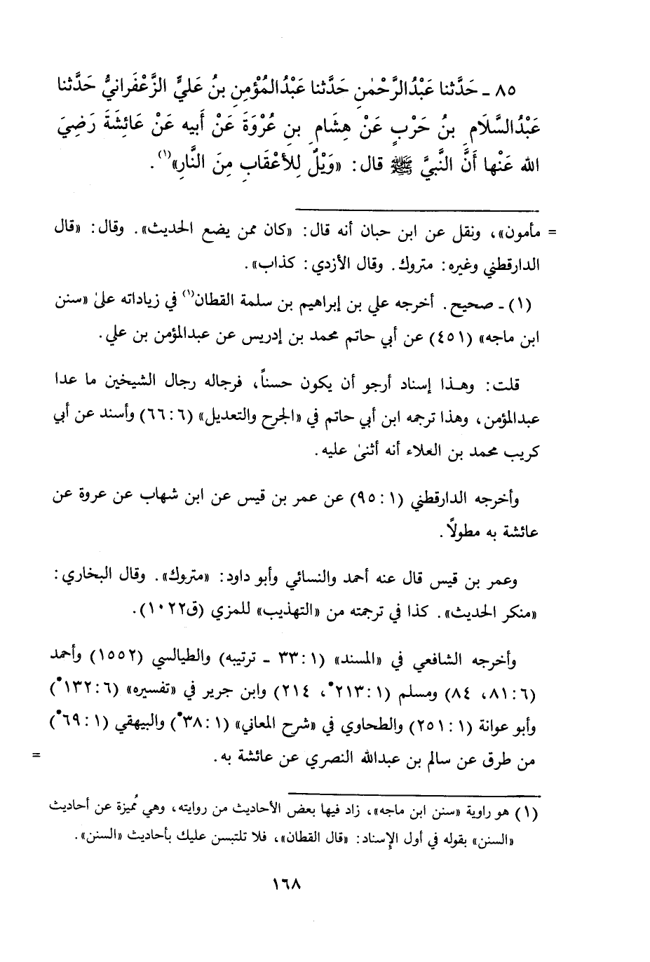85 - حَدَّثَنَا عَبْدُ الرَّحْمَنِ , حَدَّثَنَا عَبْدُ الْمُؤْمِنِ بْنُ عَلِيٍّ الزَّعْفَرَانِيُّ , حَدَّثَنَا عَبْدُ السَّلَامِ بْنُ حَرْبٍ , عَنْ هِشَامِ بْنِ عُرْوَةَ , عَنْ أَبِيهِ , عَنْ عَائِشَةَ رَضِيَ اللَّهُ عَنْهَا أَنَّ النَّبِيَّ صَلَّى اللهُ عَلَيْهِ وَسَلَّمَ قَالَ: § «وَيْلٌ لِلْأَعْقَابِ مِنَ النَّارِ»