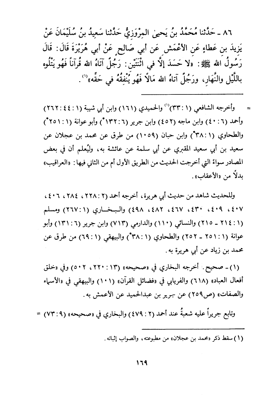 86 - حَدَّثَنَا مُحَمَّدُ بْنُ يَحْيَى الْمَرْوَزِيُّ , حَدَّثَنَا سَعِيدُ بْنُ سُلَيْمَانَ , عَنْ يَزِيدَ بْنِ عَطَاءٍ , عَنِ الْأَعْمَشِ , عَنْ أَبِي صَالِحٍ , عَنْ أَبِي هُرَيْرَةَ , قَالَ: قَالَ رَسُولُ اللَّهِ صَلَّى اللهُ عَلَيْهِ وَسَلَّمَ: " §لَا حَسَدَ إِلَّا فِي اثْنَتَيْنِ: رَجُلٍ آتَاهُ اللَّهُ قُرْآنًا فَهُوَ يَتْلُوهُ بِاللَّيْلِ وَالنَّهَارِ , وَرَجُلٍ آتَاهُ اللَّهُ مَالًا فَهُوَ يُنْفِقُهُ فِي حَقِّهِ "