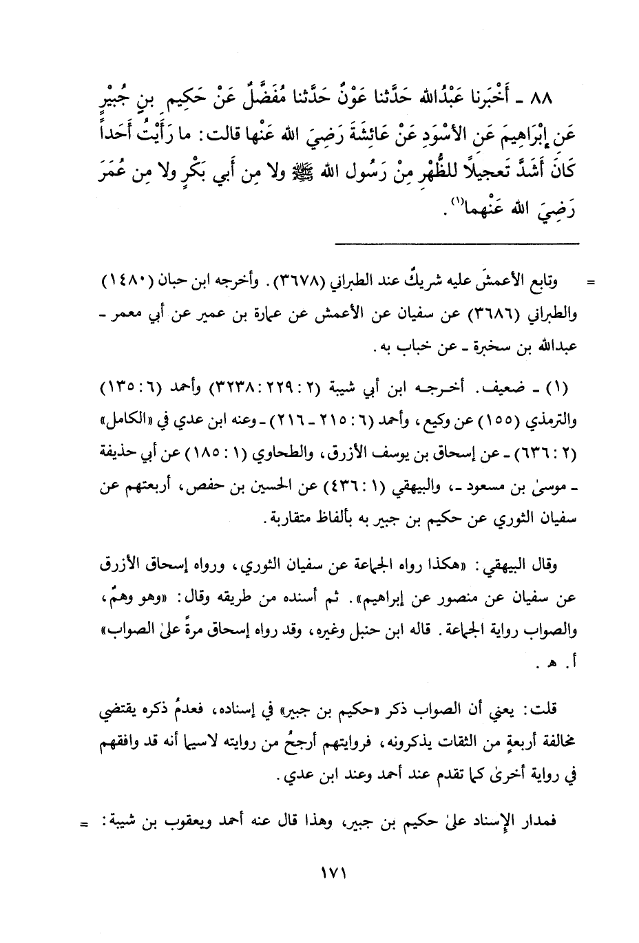 88 - أَخْبَرَنَا عَبْدُ اللَّهِ , حَدَّثَنَا عَوْنٌ , حَدَّثَنَا مُفَضَّلٌ , عَنْ حَكِيمِ بْنِ جُبَيْرٍ , عَنْ إِبْرَاهِيمَ , عَنِ الْأَسْوَدِ , عَنْ عَائِشَةَ رَضِيَ اللَّهُ عَنْهَا قَالَتْ: § «مَا رَأَيْتُ أَحَدًا كَانَ أَشَدَّ تَعْجِيلًا لِلظُّهْرِ مِنْ رَسُولِ اللَّهِ صَلَّى اللهُ عَلَيْهِ وَسَلَّمَ , وَلَا مِنْ أَبِي بَكْرٍ , وَلَا مِنْ عُمَرَ رَضِيَ اللَّهُ عَنْهُمَا»