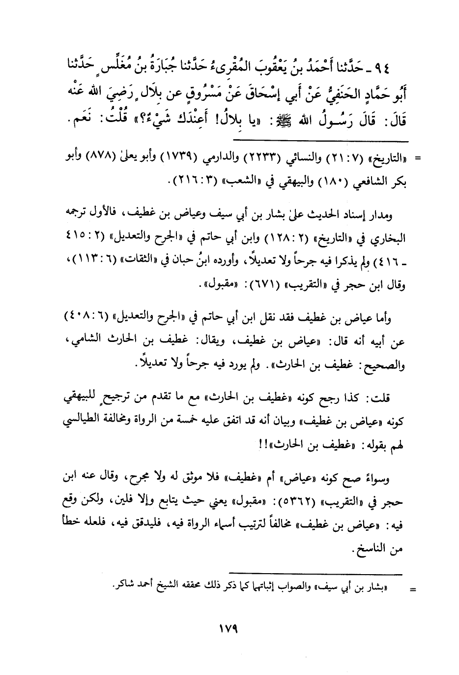 94 - حَدَّثَنَا أَحْمَدُ بْنُ يَعْقُوبَ الْمُقْرِئُ , حَدَّثَنَا جُبَارَةُ بْنُ مُغَلِّسٍ , حَدَّثَنَا أَبُو حَمَّادٍ الْحَنَفِيُّ , عَنْ أَبِي إِسْحَاقَ , عَنْ مَسْرُوقٍ , عَنْ بِلَالٍ رَضِيَ اللَّهُ عَنْهُ قَالَ: قَالَ رَسُولُ اللَّهِ صَلَّى اللهُ عَلَيْهِ وَسَلَّمَ: «يَا بِلَالُ أَعِنْدَكَ شَيْءٌ؟» قُلْتُ: نَعَمْ. فَحَمَلْتُهُ , فَقَالَ: «بَقِيَ عِنْدَكَ شَيْءٌ يَا بِلَالُ؟» قُلْتُ: مَا بَقِيَ عِنْدِي شَيْءٌ إِلَّا قَدْرُ قَبْضَةٍ. فَقَالَ: § «أَنْفِقْ يَا بِلَالُ , وَلَا تَخْشَ مِنْ ذِي الْعَرْشِ إِقْلَالًا»