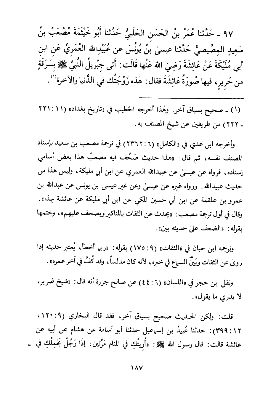 97 - حَدَّثَنَا عُمَرُ بْنُ الْحَسَنِ الْحَلَبِيُّ , حَدَّثَنَا أَبُو خَيْثَمَةَ مُصْعَبُ بْنُ سَعِيدٍ الْمِصِّيصِيُّ , حَدَّثَنَا عِيسَى بْنُ يُونُسَ , عَنْ عُبَيْدِ اللَّهِ الْعُمَرِيِّ , عَنِ ابْنِ أَبِي مُلَيْكَةَ , عَنْ عَائِشَةَ رَضِيَ اللَّهُ عَنْهَا قَالَتْ: أَتَى جِبْرِيلُ النَّبِيَّ صَلَّى اللهُ عَلَيْهِ وَسَلَّمَ بِسَرَقَةٍ مِنْ حَرِيرٍ فِيهَا صُورَةُ عَائِشَةَ , فَقَالَ: § «هَذِهِ زَوْجَتُكَ فِي الدُّنْيَا وَالْآخِرَةِ»