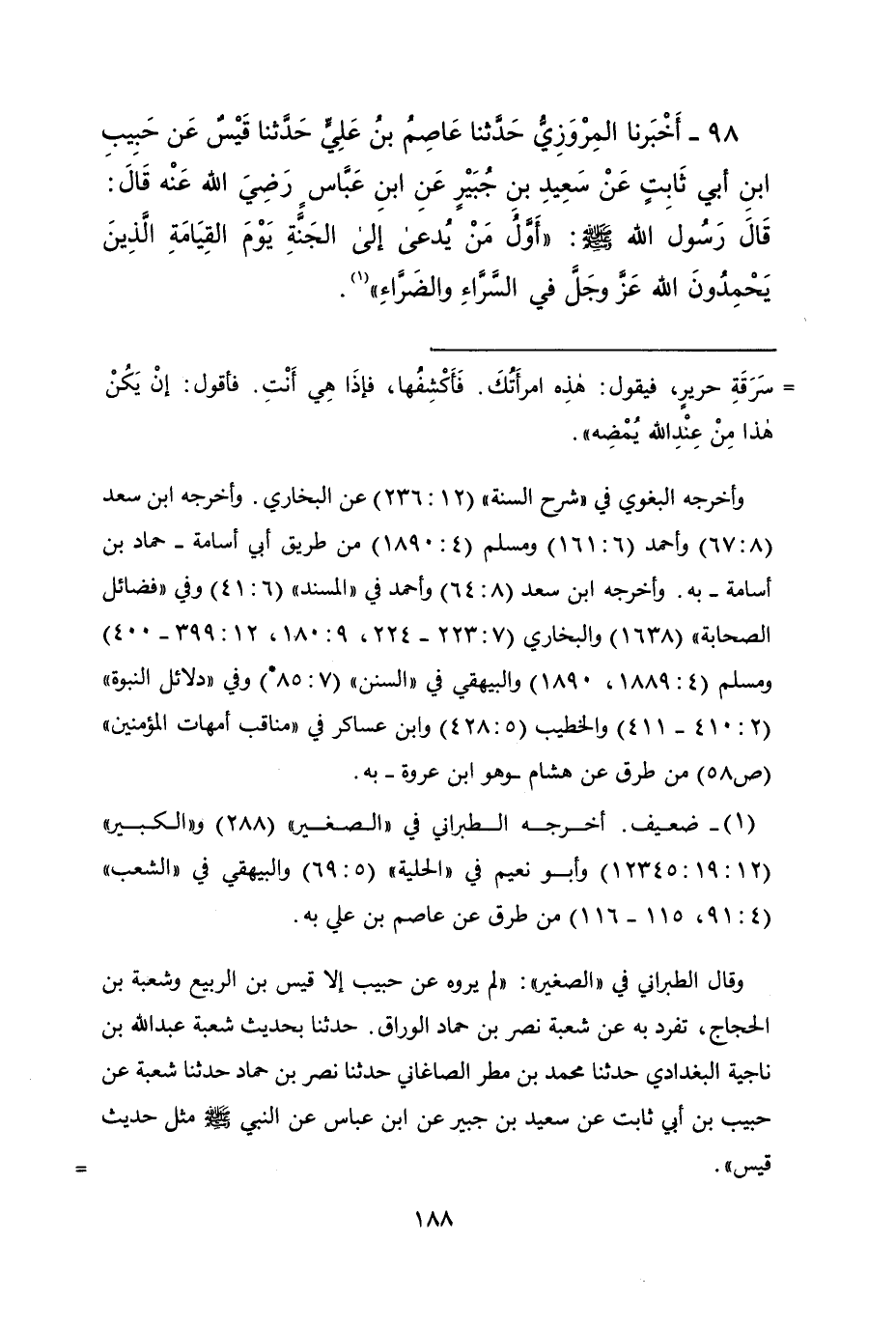 98 - أَخْبَرَنَا الْمَرْوَزِيُّ , حَدَّثَنَا عَاصِمُ بْنُ عَلِيٍّ , حَدَّثَنَا قَيْسٌ , عَنْ حَبِيبِ بْنِ أَبِي ثَابِتٍ , عَنْ سَعِيدِ بْنِ جُبَيْرٍ , عَنِ ابْنِ عَبَّاسٍ رَضِيَ اللَّهُ عَنْهُ قَالَ: قَالَ رَسُولُ اللَّهِ صَلَّى اللهُ عَلَيْهِ وَسَلَّمَ: § «أَوَّلُ مَنْ يُدْعَى إِلَى الْجَنَّةِ يَوْمَ الْقِيَامَةِ الَّذِينَ يَحْمَدُونَ اللَّهَ عَزَّ وَجَلَّ فِي السَّرَّاءِ وَالضَّرَّاءِ»
