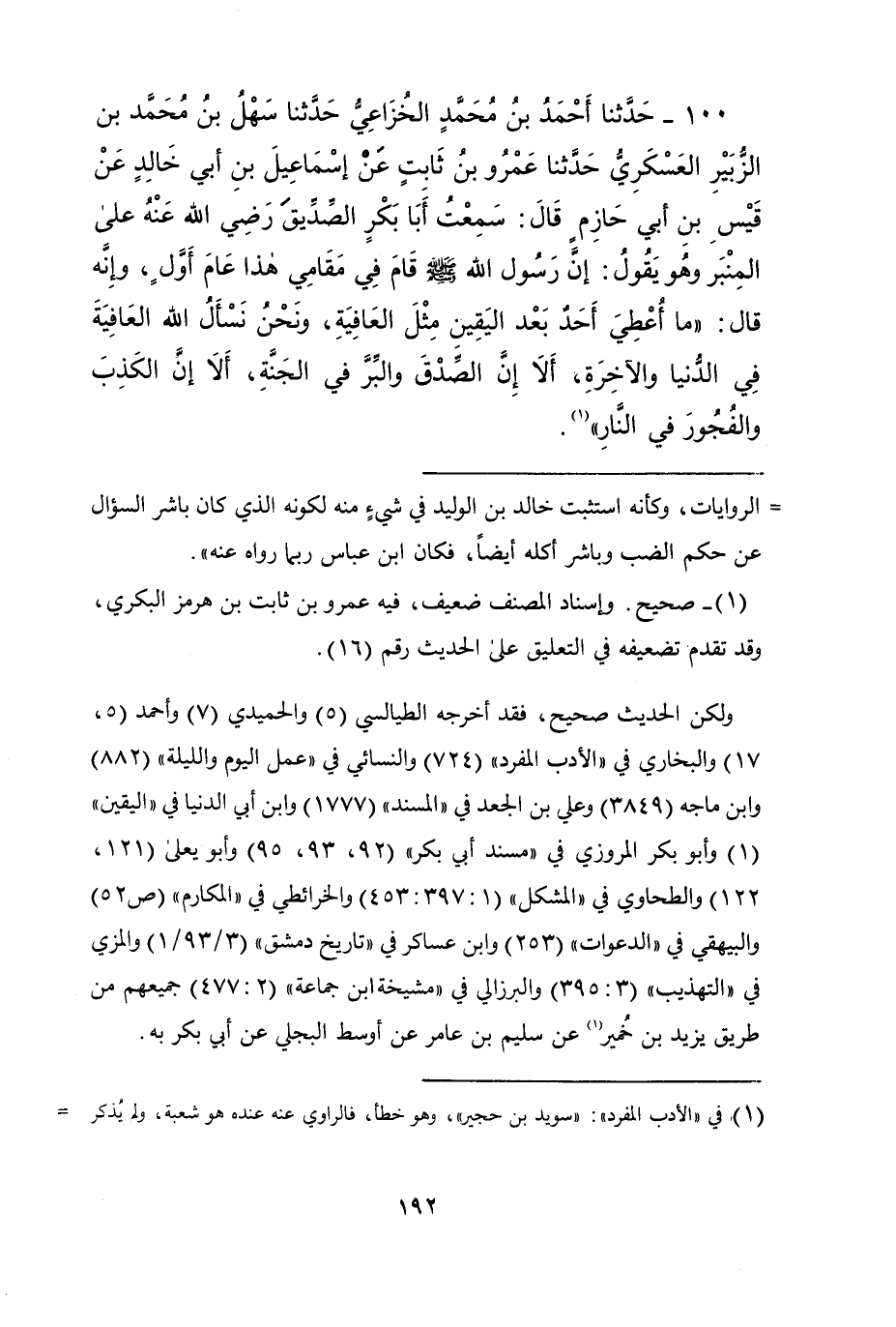 100 - حَدَّثَنَا أَحْمَدُ بْنُ مُحَمَّدٍ الْخُزَاعِيُّ , حَدَّثَنَا سَهْلُ بْنُ مُحَمَّدِ بْنِ الزُّبَيْرِ الْعَسْكَرِيُّ , حَدَّثَنَا عَمْرُو بْنُ ثَابِتٍ , عَنْ إِسْمَاعِيلَ بْنِ أَبِي خَالِدٍ , عَنْ قَيْسِ بْنِ أَبِي حَازِمٍ , قَالَ: سَمِعْتُ أَبَا بَكْرٍ الصِّدِّيقَ رَضِيَ اللَّهُ عَنْهُ عَلَى الْمِنْبَرِ وَهُوَ يَقُولُ: إِنَّ رَسُولَ اللَّهِ صَلَّى اللهُ عَلَيْهِ وَسَلَّمَ قَامَ فِي مَقَامِي هَذَا عَامَ أَوَّلَ , وَإِنَّهُ قَالَ: § «مَا أُعْطِيَ أَحَدٌ بَعْدَ الْيَقِينِ مِثْلَ الْعَافِيَةِ , وَنَحْنُ نَسْأَلُ اللَّهَ الْعَافِيَةَ فِي الدُّنْيَا وَالْآخِرَةِ , أَلَا إِنَّ الصِّدْقَ وَالْبِرَّ فِي الْجَنَّةِ , أَلَا إِنَّ الْكَذِبَ وَالْفُجُورَ فِي النَّارِ»