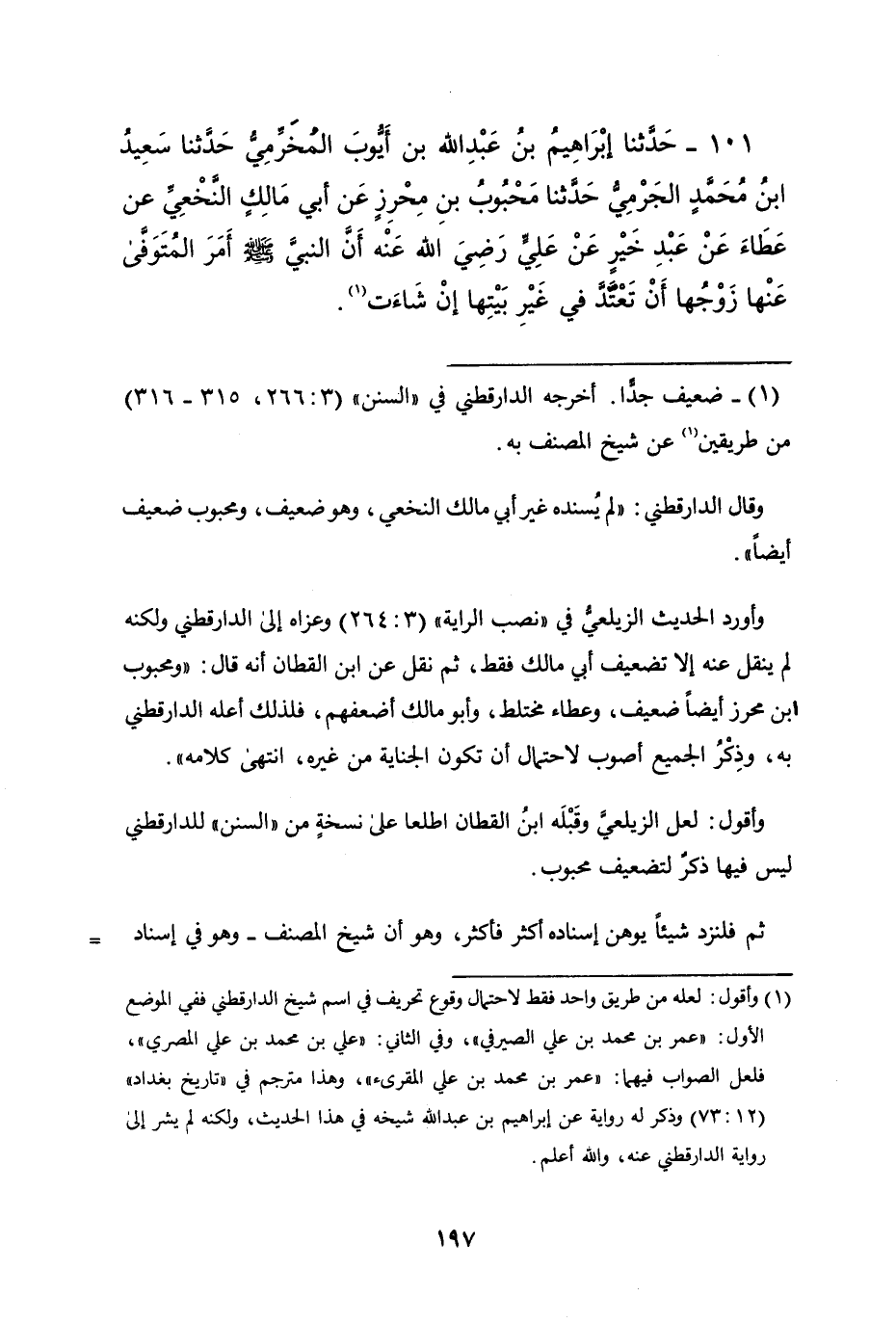 101 - حَدَّثَنَا إِبْرَاهِيمُ بْنُ عَبْدِ اللَّهِ بْنِ أَيُّوبَ الْمُخَرِّمِيُّ , حَدَّثَنَا سَعِيدُ بْنُ مُحَمَّدٍ الْجَرْمِيُّ , حَدَّثَنَا مَحْبُوبُ بْنُ مُحْرِزٍ , عَنْ أَبِي مَالِكٍ النَّخَعِيِّ , عَنْ عَطَاءٍ , عَنْ عَبْدِ خَيْرٍ , عَنْ عَلِيٍّ رَضِيَ اللَّهُ عَنْهُ أَنَّ النَّبِيَّ صَلَّى اللهُ عَلَيْهِ وَسَلَّمَ § «أَمَرَ الْمُتَوَفَّى عَنْهَا زَوْجُهَا أَنْ تَعْتَدَّ فِي غَيْرِ بَيْتِهَا إِنْ شَاءَتْ»