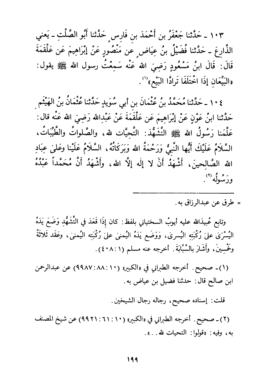104 - حَدَّثَنَا مُحَمَّدُ بْنُ عُثْمَانَ بْنِ أَبِي سُوَيْدٍ , حَدَّثَنَا عُثْمَانُ بْنُ الْهَيْثَمِ , حَدَّثَنَا ابْنُ عَوْنٍ , عَنْ إِبْرَاهِيمَ , عَنْ عَلْقَمَةَ , عَنْ عَبْدِ اللَّهِ رَضِيَ اللَّهُ عَنْهُ قَالَ: عَلَّمَنَا رَسُولُ اللَّهِ صَلَّى اللهُ عَلَيْهِ وَسَلَّمَ التَّشَهُّدَ: § «التَّحِيَّاتُ لِلَّهِ وَالصَّلَوَاتُ وَالطَّيِّبَاتُ , السَّلَامُ عَلَيْكَ أَيُّهَا النَّبِيُّ وَرَحْمَةُ اللَّهِ وَبَرَكَاتُهُ , السَّلَامُ عَلَيْنَا وَعَلَى عِبَادِ اللَّهِ الصَّالِحِينَ , أَشْهَدُ أَنْ لَا إِلَهَ إِلَّا اللَّهُ , وَأَشْهَدُ أَنَّ مُحَمَّدًا عَبْدُهُ وَرَسُولُهُ»