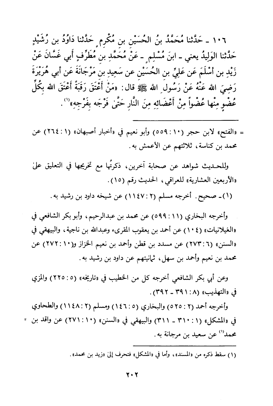 106 - حَدَّثَنَا مُحَمَّدُ بْنُ الْحُسَيْنِ بْنِ مُكْرَمٍ , حَدَّثَنَا دَاوُدُ بْنُ رُشَيْدٍ , حَدَّثَنَا الْوَلِيدُ - يَعْنِي ابْنَ مُسْلِمٍ - عَنْ مُحَمَّدِ بْنِ مُطَرِّفٍ أَبِي غَسَّانَ , عَنْ زَيْدِ بْنِ أَسْلَمَ , عَنْ عَلِيِّ بْنِ الْحُسَيْنِ , عَنْ سَعِيدِ بْنِ مَرْجَانَةَ , عَنْ أَبِي هُرَيْرَةَ رَضِيَ اللَّهُ عَنْهُ , عَنْ رَسُولِ اللَّهِ صَلَّى اللهُ عَلَيْهِ وَسَلَّمَ قَالَ: § «مَنْ أَعْتَقَ رَقَبَةً أَعْتَقَ اللَّهُ بِكُلِّ عُضْوٍ مِنْهَا عُضْوًا مِنْ أَعْضَائِهِ مِنَ النَّارِ حَتَّى فَرْجَهُ بِفَرْجِهِ»