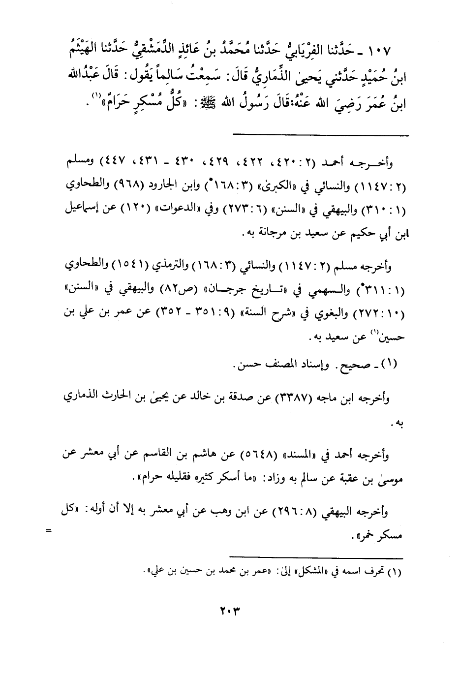 107 - حَدَّثَنَا الْفِرْيَابِيُّ , حَدَّثَنَا مُحَمَّدُ بْنُ عَائِذٍ الدِّمَشْقِيُّ , حَدَّثَنَا الْهَيْثَمُ بْنُ حُمَيْدٍ , حَدَّثَنِي يَحْيَى الذِّمَارِيُّ , قَالَ: سَمِعْتُ سَالِمًا يَقُولُ: قَالَ عَبْدُ اللَّهِ بْنُ عُمَرَ رَضِيَ اللَّهُ عَنْهُ: قَالَ رَسُولُ اللَّهِ صَلَّى اللهُ عَلَيْهِ وَسَلَّمَ: § «كُلُّ مُسْكِرٍ حَرَامٌ»