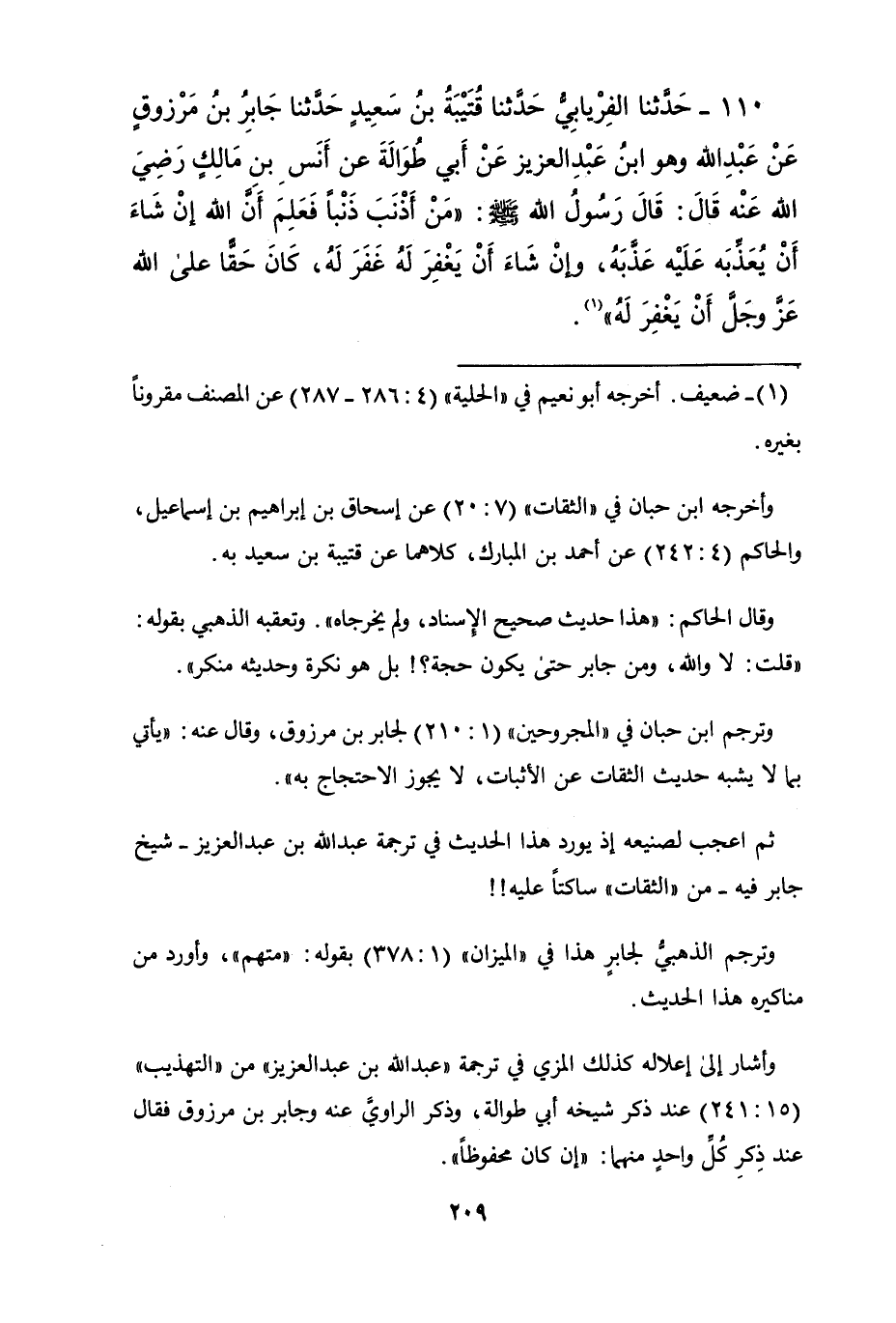 110 - حَدَّثَنَا الْفِرْيَابِيُّ , حَدَّثَنَا قُتَيْبَةُ بْنُ سَعِيدٍ , حَدَّثَنَا جَابِرُ بْنُ مَرْزُوقٍ , عَنْ عَبْدِ اللَّهِ - وَهُوَ ابْنُ عَبْدِ الْعَزِيزِ - عَنْ أَبِي طُوَالَةَ , عَنْ أَنَسِ بْنِ مَالِكٍ رَضِيَ اللَّهُ عَنْهُ قَالَ: قَالَ رَسُولُ اللَّهِ صَلَّى اللهُ عَلَيْهِ وَسَلَّمَ: § «مَنْ أَذْنَبَ ذَنْبًا فَعَلِمَ أَنَّ اللَّهَ إِنْ شَاءَ أَنْ يُعَذِّبَهُ عَلَيْهِ عَذَّبَهُ , وَإِنْ شَاءَ أَنْ يَغْفِرَ لَهُ غَفَرَ لَهُ , كَانَ حَقًّا عَلَى اللَّهِ عَزَّ وَجَلَّ أَنْ يَغْفِرَ لَهُ»