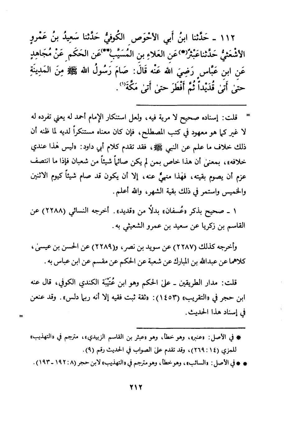 112 - حَدَّثَنَا ابْنُ أَبِي الْأَحْوَصِ الْكُوفِيُّ , حَدَّثَنَا سَعِيدُ بْنُ عَمْرٍو الْأَشْعَثِيُّ , حَدَّثَنَا عَبْثَرٌ , عَنِ الْعَلَاءِ بْنِ الْمُسَيَّبِ , عَنِ الْحَكَمِ , عَنْ مُجَاهِدٍ , عَنِ ابْنِ عَبَّاسٍ رَضِيَ اللَّهُ عَنْهُ قَالَ: §«صَامَ رَسُولُ اللَّهِ صَلَّى اللهُ عَلَيْهِ وَسَلَّمَ مِنَ الْمَدِينَةِ حَتَّى أَتَى قُدَيْدًا , ثُمَّ أَفْطَرَ حَتَّى أَتَى مَكَّةَ»