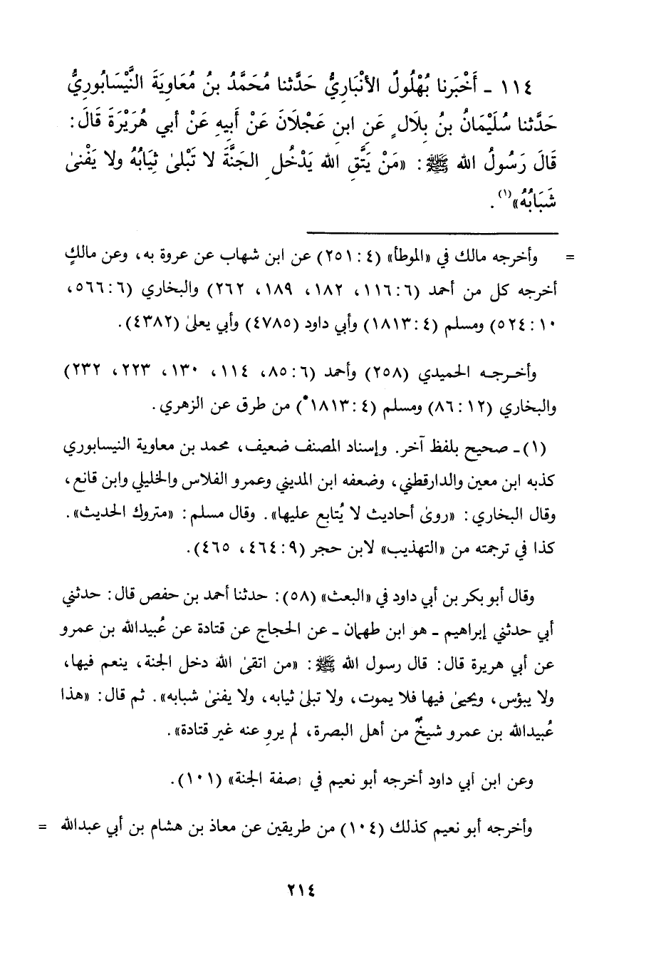 114 - أَخْبَرَنَا بُهْلُولٌ الْأَنْبَارِيُّ , حَدَّثَنَا مُحَمَّدُ بْنُ مُعَاوِيَةَ النَّيْسَابُورِيُّ , حَدَّثَنَا سُلَيْمَانُ بْنُ بِلَالٍ , عَنِ ابْنِ عَجْلَانَ , عَنْ أَبِيهِ , عَنْ أَبِي هُرَيْرَةَ , قَالَ: قَالَ رَسُولُ اللَّهِ صَلَّى اللهُ عَلَيْهِ وَسَلَّمَ: §«مَنْ يَتَّقِ اللَّهَ يَدْخُلِ الْجَنَّةَ , لَا تَبْلَى ثِيَابُهُ , وَلَا يَفْنَى شَبَابُهُ»