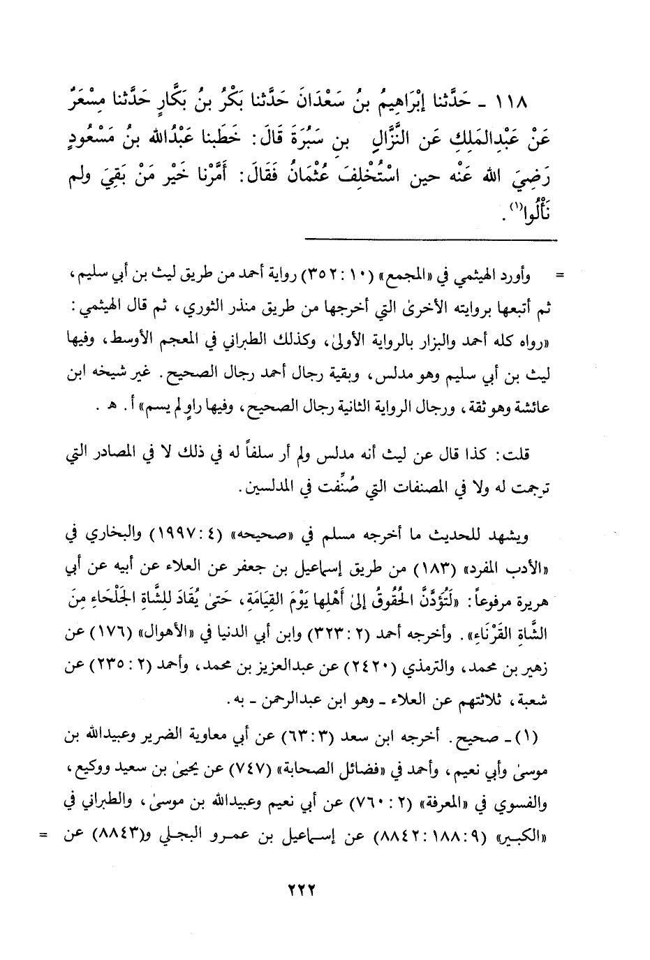 118 - حَدَّثَنَا إِبْرَاهِيمُ بْنُ سَعْدَانَ , حَدَّثَنَا بَكْرُ بْنُ بَكَّارٍ , حَدَّثَنَا مِسْعَرٌ , عَنْ عَبْدِ الْمَلِكِ , عَنِ النَّزَّالِ بْنِ سَبْرَةَ , قَالَ: خَطَبَنَا عَبْدُ اللَّهِ بْنُ مَسْعُودٍ رَضِيَ اللَّهُ عَنْهُ حِينَ اسْتُخْلِفَ عُثْمَانُ , فَقَالَ: §«أَمَّرْنَا خَيْرَ مَنْ بَقِيَ وَلَمْ نَأْلُوا»