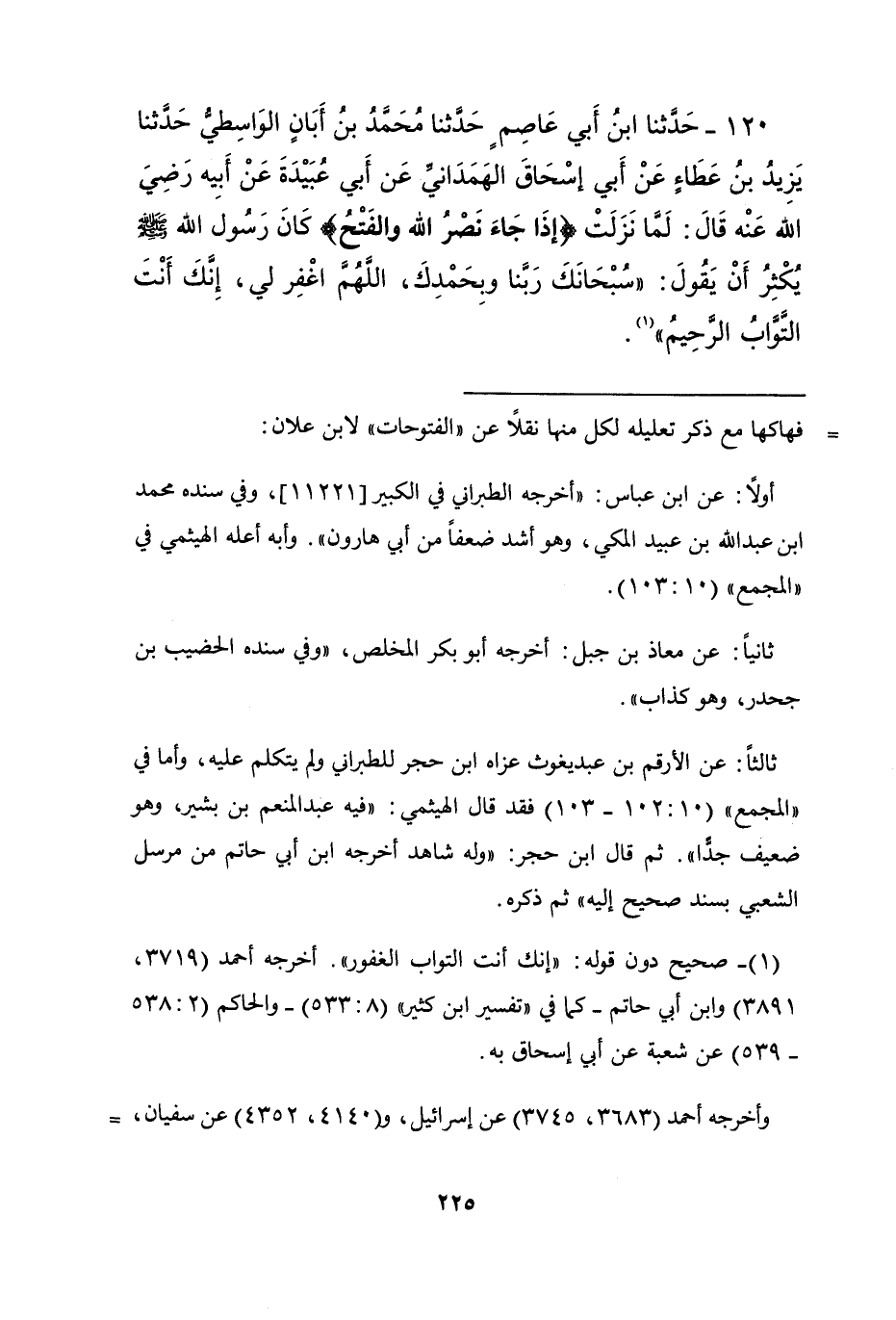 120 - حَدَّثَنَا ابْنُ أَبِي عَاصِمٍ , حَدَّثَنَا مُحَمَّدُ بْنُ أَبَانَ الْوَاسِطِيُّ , حَدَّثَنَا يَزِيدُ بْنُ عَطَاءٍ , عَنْ أَبِي إِسْحَاقَ الْهَمْدَانِيِّ , عَنْ أَبِي عُبَيْدَةَ , عَنْ أَبِيهِ رَضِيَ اللَّهُ عَنْهُ قَالَ: لَمَّا نَزَلَتْ: إِذَا جَاءَ نَصْرُ اللَّهِ وَالْفَتْحُ كَانَ رَسُولُ اللَّهِ صَلَّى اللهُ عَلَيْهِ وَسَلَّمَ يُكْثِرُ أَنْ يَقُولَ: §«سُبْحَانَكَ رَبَّنَا وَبِحَمْدِكَ , اللَّهُمَّ اغْفِرْ لِي , إِنَّكَ أَنْتَ التَّوَّابُ الرَّحِيمُ»