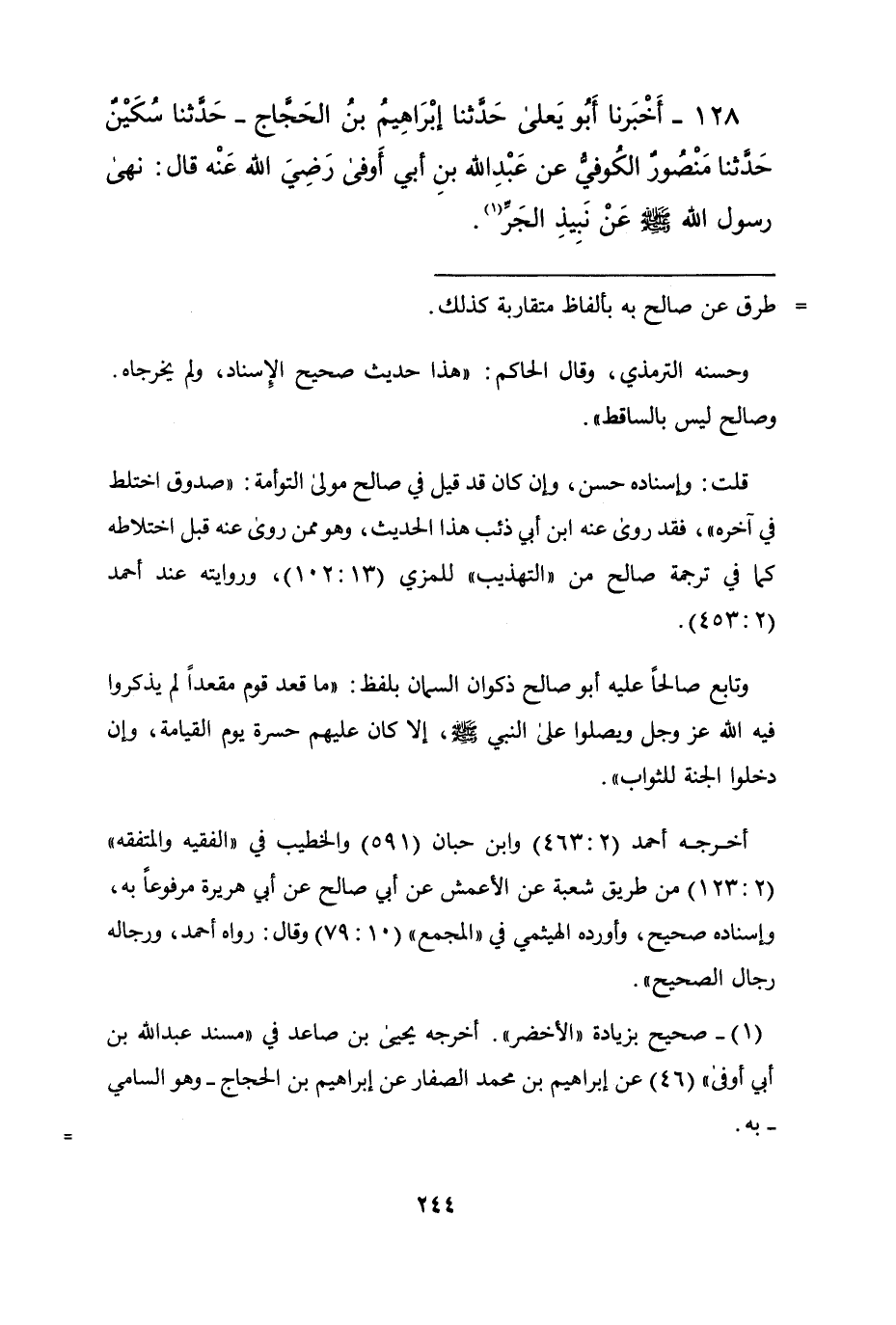 128 - أَخْبَرَنَا أَبُو يَعْلَى , حَدَّثَنَا إِبْرَاهِيمُ بْنُ الْحَجَّاجِ , حَدَّثَنَا سُكَيْنٌ , حَدَّثَنَا مَنْصُورٌ الْكُوفِيُّ , عَنْ عَبْدِ اللَّهِ بْنِ أَبِي أَوْفَى رَضِيَ اللَّهُ عَنْهُ قَالَ: §«نَهَى رَسُولُ اللَّهِ صَلَّى اللهُ عَلَيْهِ وَسَلَّمَ عَنْ نَبِيذِ الْجَرِّ»