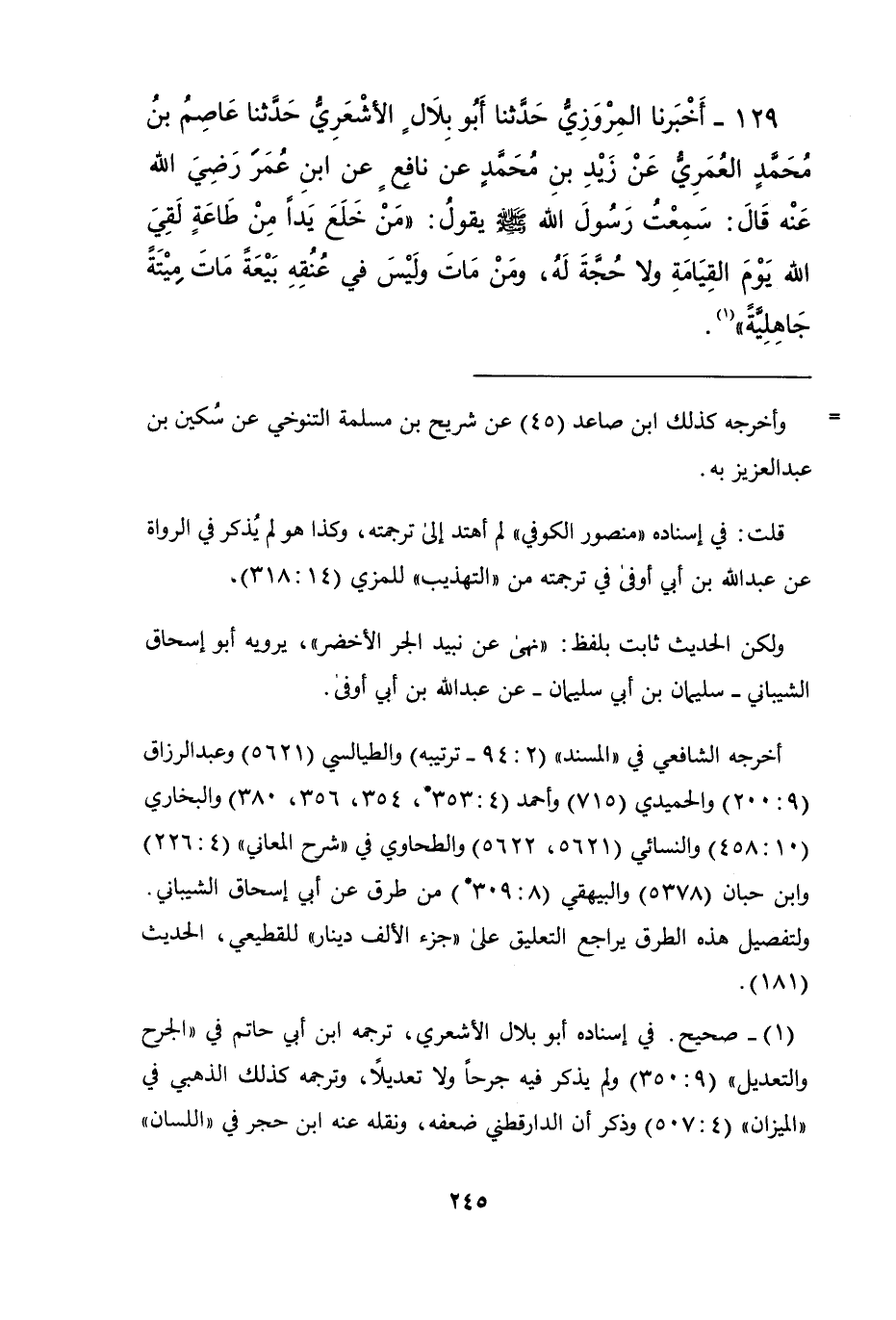 129 - أَخْبَرَنَا الْمَرْوَزِيُّ , حَدَّثَنَا أَبُو بِلَالٍ الْأَشْعَرِيُّ , حَدَّثَنَا عَاصِمُ بْنُ مُحَمَّدٍ الْعُمَرِيُّ , عَنْ زَيْدِ بْنِ مُحَمَّدٍ , عَنْ نَافِعٍ , عَنِ ابْنِ عُمَرَ رَضِيَ اللَّهُ عَنْهُ قَالَ: سَمِعْتُ رَسُولَ اللَّهِ صَلَّى اللهُ عَلَيْهِ وَسَلَّمَ يَقُولُ: §«مَنْ خَلَعَ يَدًا مِنْ طَاعَةٍ لَقِيَ اللَّهَ يَوْمَ الْقِيَامَةِ وَلَا حُجَّةَ لَهُ , وَمَنْ مَاتَ وَلَيْسَ فِي عُنُقِهِ بَيْعَةٌ مَاتَ مِيتَةَ جَاهِلِيَّةٍ»