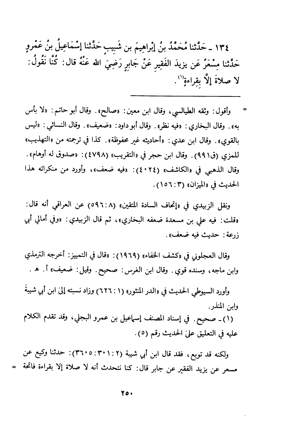134 - حَدَّثَنَا مُحَمَّدُ بْنُ إِبْرَاهِيمَ بْنِ شَبِيبٍ , حَدَّثَنَا إِسْمَاعِيلُ بْنُ عَمْرٍو , حَدَّثَنَا مِسْعَرٌ , عَنْ يَزِيدَ الْفَقِيرِ , عَنْ جَابِرٍ رَضِيَ اللَّهُ عَنْهُ قَالَ: " §كُنَّا نَقُولُ: لَا صَلَاةَ إِلَّا بِقِرَاءَةٍ "