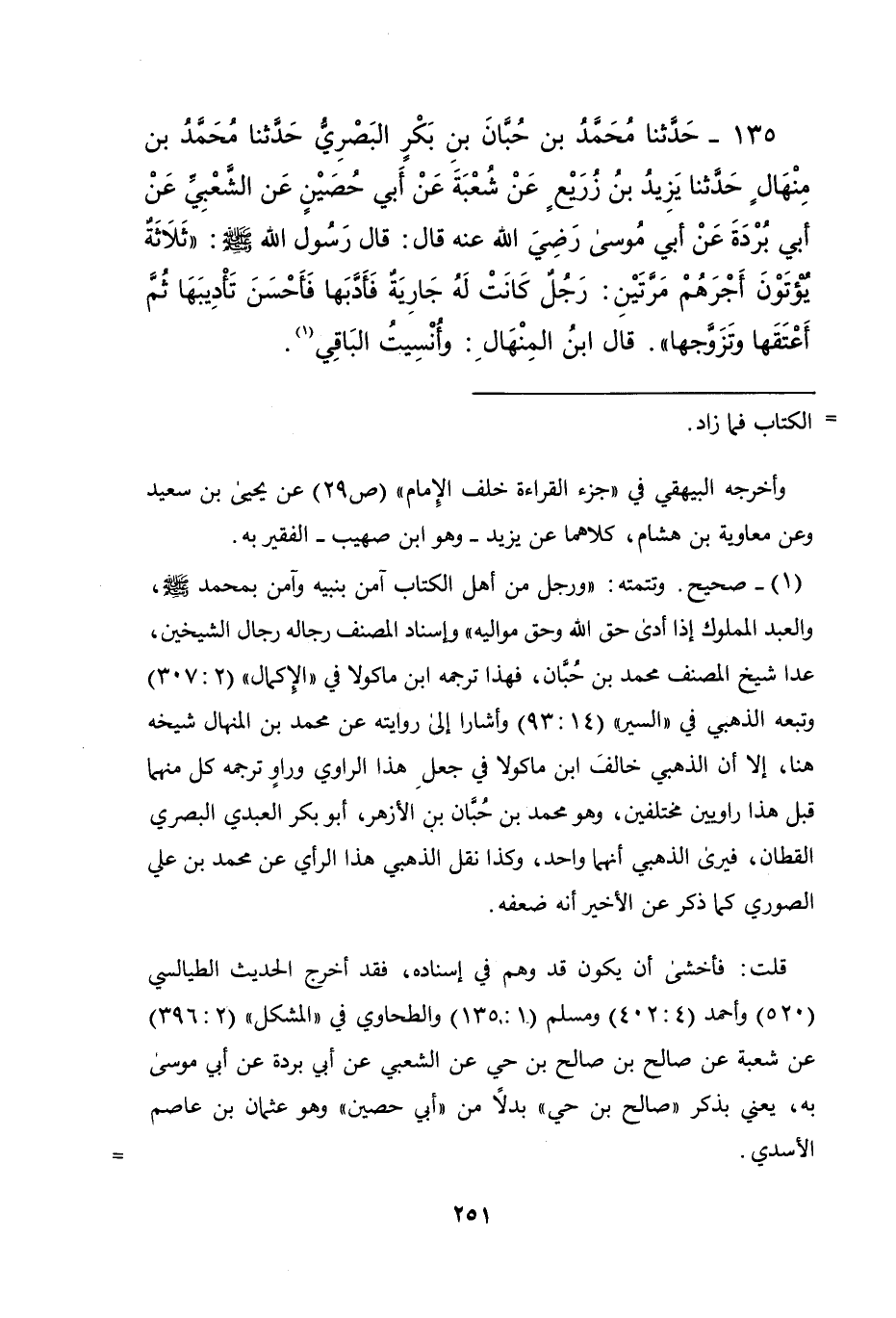 135 - حَدَّثَنَا مُحَمَّدُ بْنُ حِبَّانَ بْنِ بَكْرٍ الْبَصْرِيُّ , حَدَّثَنَا مُحَمَّدُ بْنُ مِنْهَالٍ , حَدَّثَنَا يَزِيدُ بْنُ زُرَيْعٍ , عَنْ شُعْبَةَ , عَنْ أَبِي حُصَيْنٍ , عَنِ الشَّعْبِيِّ , عَنْ أَبِي بُرْدَةَ , عَنْ أَبِي مُوسَى رَضِيَ اللَّهُ عَنْهُ قَالَ: قَالَ رَسُولُ اللَّهِ صَلَّى اللهُ عَلَيْهِ وَسَلَّمَ: " §ثَلَاثَةٌ يُؤْتَوْنَ أَجْرَهُمْ مَرَّتَيْنِ: رَجُلٌ كَانَتْ لَهُ جَارِيَةٌ فَأَدَّبَهَا فَأَحْسَنَ تَأْدِيبَهَا ثُمَّ أَعْتَقَهَا وَتَزَوَّجَهَا ". قَالَ ابْنُ الْمِنْهَالِ: وَأُنْسِيتُ الْبَاقِيَ