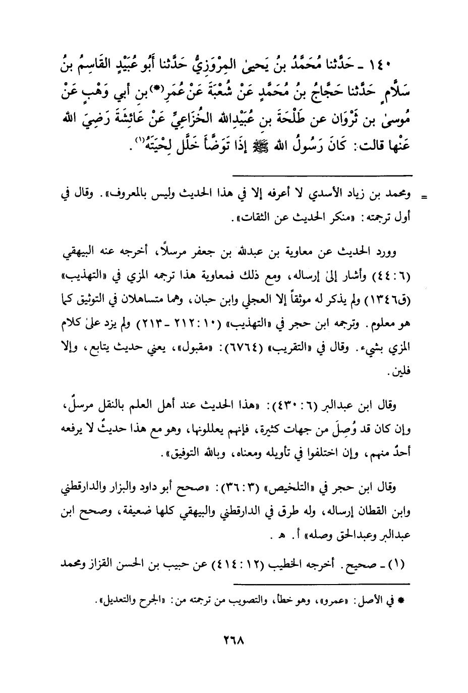 140 - حَدَّثَنَا مُحَمَّدُ بْنُ يَحْيَى الْمَرْوَزِيُّ , حَدَّثَنَا أَبُو عُبَيْدٍ الْقَاسِمُ بْنُ سَلَّامٍ , حَدَّثَنَا حَجَّاجُ بْنُ مُحَمَّدٍ , عَنْ شُعْبَةَ , عَنْ عُمَرَ بْنِ أَبِي وَهْبٍ , عَنْ مُوسَى بْنِ ثَرْوَانَ , عَنْ طَلْحَةَ بْنِ عُبَيْدِ اللَّهِ الْخُزَاعِيِّ , عَنْ عَائِشَةَ رَضِيَ اللَّهُ عَنْهَا قَالَتْ: «كَانَ رَسُولُ اللَّهِ صَلَّى اللهُ عَلَيْهِ وَسَلَّمَ §إِذَا تَوَضَّأَ خَلَّلَ لِحْيَتَهُ»