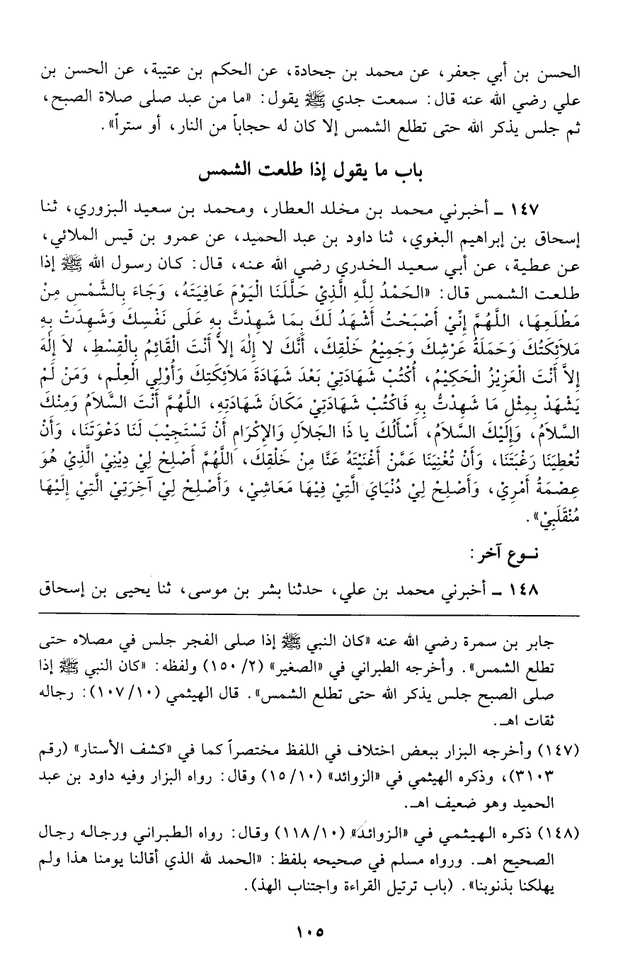 117 - أَخْبَرَنَا أَبُو يَعْلَى، حَدَّثَنَا إِبْرَاهِيمُ بْنُ الْحَجَّاجِ السَّامِيُّ، حَدَّثَنَا حَمَّادُ بْنُ سَلَمَةَ، عَنْ ثَابِتٍ، عَنْ عَبْدِ الرَّحْمَنِ بْنِ أَبِي لَيْلَى، عَنْ صُهَيْبٍ، رَضِيَ اللَّهُ عَنْهُ أَنَّ رَسُولَ اللَّهِ صَلَّى اللهُ عَلَيْهِ وَسَلَّمَ كَانَ §يُحَرِّكُ شَفَتَيْهِ بَعْدَ صَلَاةِ الْفَجْرِ بِشَيْءٍ، فَقُلْتُ: يَا رَسُولَ اللَّهِ، إِنَّكَ تُحَرِّكُ شَفَتَيْكَ بِشَيْءٍ مَا كُنْتَ تَفْعَلُ، مَا هَذَا الَّذِي تَقُولُ؟ قَالَ: " أَقُولُ: اللَّهُمَّ بِكَ أُحَاوِلُ، وَبِكَ أُصَاوِلُ، وَبِكَ أُقَاتِلُ "
