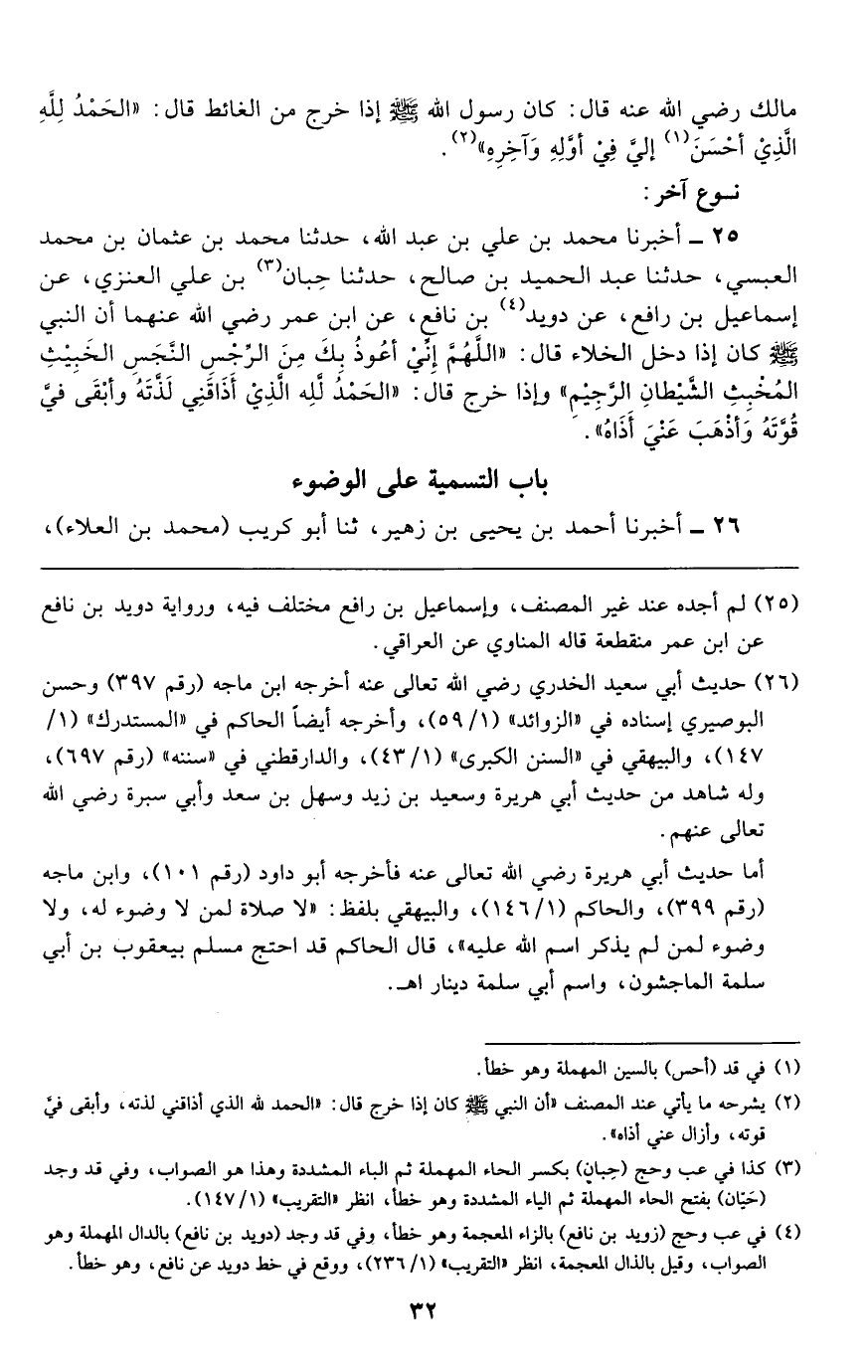 31 - أَخْبَرَنَا أَبُو عَبْدِ الرَّحْمَنِ، أَخْبَرَنَا سُوَيْدُ بْنُ نَصْرٍ، أَخْبَرَنَا عَبْدُ اللَّهِ، عَنْ حَيْوَةَ بْنِ شُرَيْحٍ، أَخْبَرَنِي زُهْرَةُ بْنُ مَعْبَدٍ، أَنَّ ابْنَ عَمِّهِ، أَخِي أَبِيهِ حَدَّثَهُ أَنَّ عُقْبَةَ بْنَ عَامِرٍ حَدَّثَهُ قَالَ: قَالَ لِي عُمَرُ بْنُ الْخَطَّابِ رَضِيَ اللَّهُ عَنْهُ قَالَ: قَالَ رَسُولُ اللَّهِ صَلَّى اللهُ عَلَيْهِ وَسَلَّمَ: " §مَنْ تَوَضَّأَ فَأَحْسَنَ الْوُضُوءَ، ثُمَّ رَفَعَ بَصَرَهُ إِلَى السَّمَاءِ، فَقَالَ -[33]-: أَشْهَدُ أَنْ لَا إِلَهَ إِلَّا اللَّهُ، وَحْدَهُ لَا شَرِيكَ لَهُ، وَأَشْهَدُ أَنَّ مُحَمَّدًا عَبْدُهُ وَرَسُولُهُ، فُتِحَتْ لَهُ ثَمَانِيَةُ أَبْوَابِ الْجَنَّةِ يَدْخُلُ مِنْ أَيِّهَا شَاءَ "