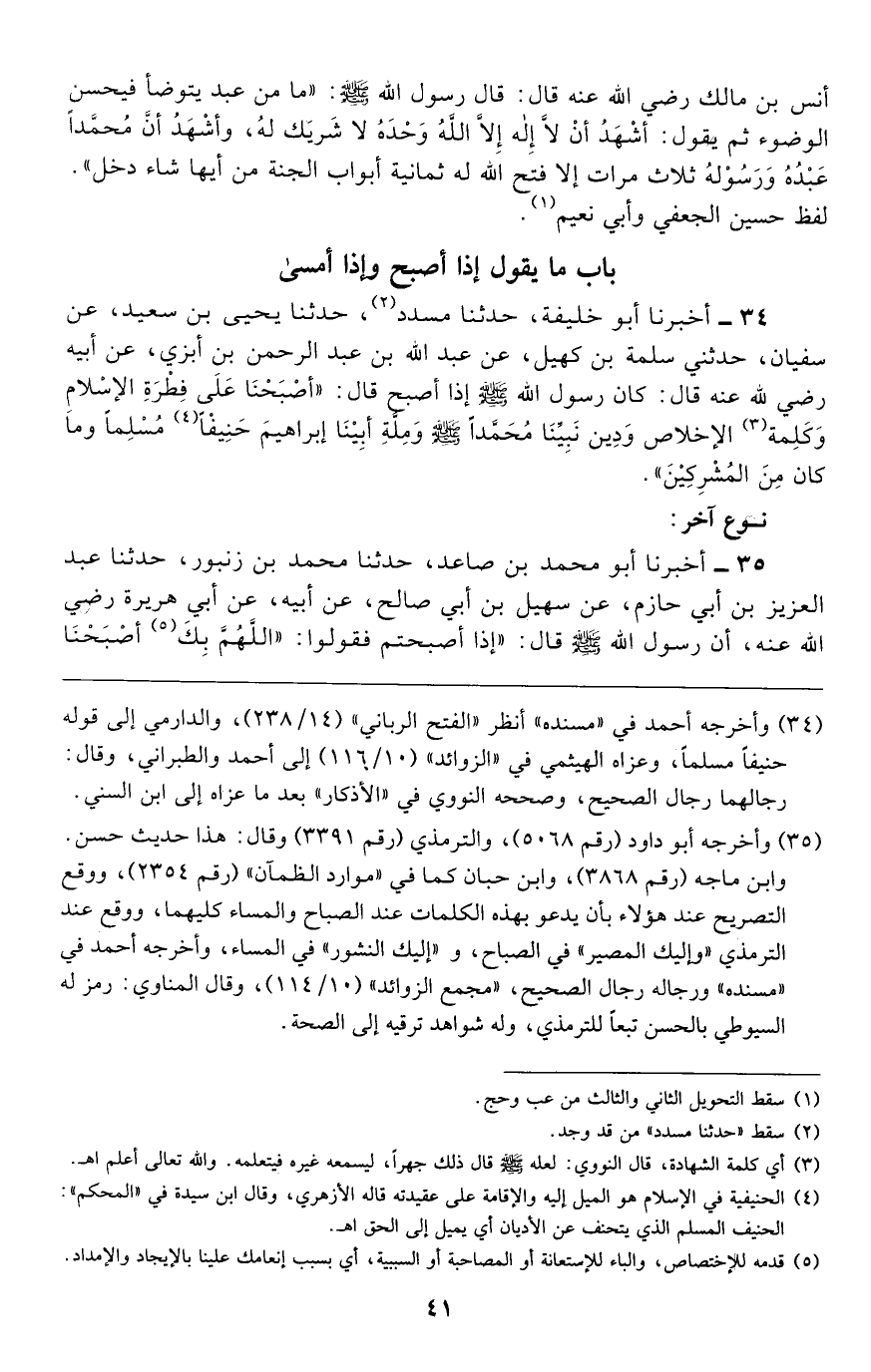 40 - أَخْبَرَنَا أَبُو عَبْدِ الرَّحْمَنِ، حَدَّثَنَا عَمْرُو بْنُ مَنْصُورٍ، حَدَّثَنَا أَبُو نُعَيْمٍ، عَنْ عُبَادَةَ بْنِ مُسْلِمٍ، حَدَّثَنِي جُبَيْرُ بْنُ أَبِي سُلَيْمَانَ بْنِ جُبَيْرِ بْنِ مُطْعِمٍ، أَنَّهُ كَانَ جَالِسًا مَعَ ابْنِ عُمَرَ رَضِيَ اللَّهُ عَنْهُمَا فَقَالَ: سَمِعْتُ رَسُولَ اللَّهِ صَلَّى اللهُ عَلَيْهِ وَسَلَّمَ يَقُولُ فِي §دُعَائِهِ حِينَ يُمْسِي وَحِينَ يُصْبِحُ: «اللَّهُمَّ إِنِّي أَسْأَلُكَ الْعَافِيَةَ فِي الدُّنْيَا وَالْآخِرَةِ، اللَّهُمَّ إِنِّي أَسْأَلُكَ الْعَفْوَ وَالْعَافِيَةَ فِي دِينِي وَدُنْيَايَ وَأَهْلِي وَمَالِي، اللَّهُمَّ اسْتُرْ عَوْرَاتِي، وَآمِنْ رَوْعَاتِي، اللَّهُمَّ احْفَظْنِي مِنْ بَيْنِ يَدَيِّ وَمِنْ خَلْفِي، وَعَنْ يَمِينِي وَعَنْ شِمَالِي، وَمِنْ فَوْقِي، وَأَعُوذُ بِعَظَمَتِكَ أَنْ أُغْتَالَ مِنْ تَحْتِي» قَالَ جُبَيْرٌ: وَهُوَ الْخَسْفُ. قَالَ عُبَادَةُ: لَا أَدْرِي، قَوْلُ رَسُولِ اللَّهِ صَلَّى اللهُ عَلَيْهِ وَسَلَّمَ، أَوْ قَوْلُ جُبَيْرٍ