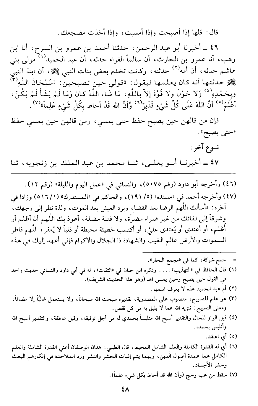 48 - حَدَّثَنَا أَبُو عَرُوبَةَ، حَدَّثَنَا سَلَمَةُ بْنُ شَبِيبٍ، ح وَأَخْبَرَنَا ابْنُ مَنِيعٍ، حَدَّثَنَا هَارُونُ بْنُ عَبْدِ اللَّهِ، قَالَ: حَدَّثَنَا زَيْدُ بْنُ الْحُبَابِ، حَدَّثَنَا عُثْمَانُ بْنُ مَوْهَبٍ، مَوْلَى بَنِي هَاشِمٍ قَالَ: سَمِعْتُ أَنَسَ بْنَ مَالِكٍ، رَضِيَ اللَّهُ عَنْهُ يَقُولُ: قَالَ رَسُولُ اللَّهِ صَلَّى اللهُ عَلَيْهِ وَسَلَّمَ لِفَاطِمَةَ رَضِيَ اللَّهُ عَنْهَا: §" مَا يَمْنَعُكِ أَنْ تَسْمَعِي مَا أُوصِيكِ تَقُولِي إِذَا أَصْبَحْتِ وَإِذَا أَمْسَيْتِ: يَا حَيُّ يَا قَيُّومُ بِرَحْمَتِكَ أَسْتَغِيثُ ". زَادَ هَارُونُ: «وَأَصْلِحْ لِي شَأْنِي كُلَّهُ، وَلَا تَكِلْنِي إِلَى نَفْسِي طَرْفَةَ عَيْنٍ أَبَدًا»