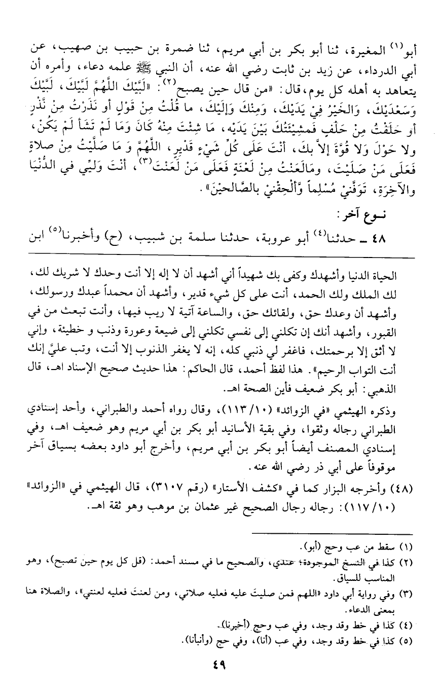 50 - حَدَّثَنَا عُمَرُ بْنُ سَهْلٍ، حَدَّثَنَا مُحَمَّدُ بْنُ أَبِي غَالِبٍ، حَدَّثَنَا عَبْدُ الصَّمَدِ بْنُ النُّعْمَانِ، حَدَّثَنَا عَبْدُ الْمَلِكِ بْنُ الْحُسَيْنِ، عَنْ عَبْدِ الْعَزِيزِ بْنِ رُفَيْعٍ، عَنْ ذَكْوَانَ، عَنْ أَبِي هُرَيْرَةَ، رَضِيَ اللَّهُ عَنْهُ قَالَ: كَانَ رَسُولُ اللَّهِ صَلَّى اللهُ عَلَيْهِ وَسَلَّمَ §إِذَا أَصْبَحَ قَالَ: «اللَّهُمَّ بِكَ أَصْبَحْنَا، وَبِكَ أَمْسَيْنَا، وَبِكَ حَيَاتُنَا وَمَوْتُنَا، وَإِلَيْكَ النُّشُورُ، أَعُوذُ بِكَلِمَاتِ اللَّهِ التَّامَّاتِ مِنْ شَرِّ السَّامَّةِ وْالْهَامَّةِ، وَأَعُوذُ بِكَلِمَاتِ اللَّهِ التَّامَّةِ مِنْ شَرِّ عِقَابِهِ، وَشَرِّ عِبَادِهِ» وَإِذَا أَمْسَى قَالَ مِثْلَ ذَلِكَ، غَيْرَ أَنَّهُ يَقُولُ: «وَإِلَيْكَ الْمَصِيرُ»