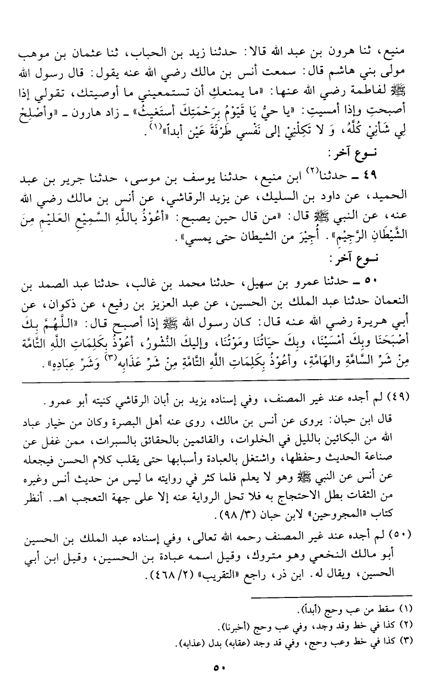 51 - أَخْبَرَنَا عَبْدُ اللَّهِ بْنُ زَيْدَانَ، أَخْبَرَنَا أَبُو كُرَيْبٍ، حَدَّثَنَا زَيْدُ بْنُ الْحُبَابِ، حَدَّثَنَا سُفْيَانُ، عَنْ رَجُلٍ، عَنْ مُجَاهِدٍ، عَنِ ابْنِ عَبَّاسٍ، رَضِيَ اللَّهُ عَنْهُمَا أَنَّ رَجُلًا، شَكَا إِلَى رَسُولِ اللَّهِ صَلَّى اللهُ عَلَيْهِ وَسَلَّمَ أَنَّهُ يُصِيبُهُ الْآفَاتُ، فَقَالَ لَهُ رَسُولُ اللَّهِ صَلَّى اللهُ عَلَيْهِ وَسَلَّمَ: " §قُلْ إِذَا أَصْبَحْتَ: بِسْمِ اللَّهِ عَلَى نَفْسِي وَأَهْلِي وَمَالِي، فَإِنَّهُ لَا يَذْهَبُ لَكَ شَيْءٌ " فَقَالَهُنَّ الرَّجُلُ؛ فَذَهَبَتْ عَنْهُ الْآفَاتُ