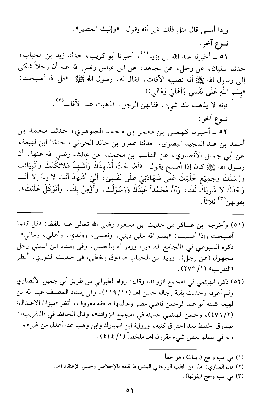53 - حَدَّثَنِي عَزْرَةُ بْنُ عَبْدِ الدَّايِمِ، حَدَّثَنَا سُلَيْمَانُ بْنُ الرَّبِيعِ النَّهْدِيُّ، حَدَّثَنَا كَادِحُ بْنُ رَحْمَةَ، عَنْ أَبِي سَعِيدٍ الْعَبْدِيِّ، زَوْج أُمِّ سَعِيدٍ عَنِ الْحَسَنِ، عَنْ أَبِي هُرَيْرَةَ، رَضِيَ اللَّهُ عَنْهُ قَالَ: قَالَ رَسُولُ اللَّهِ صَلَّى اللهُ عَلَيْهِ وَسَلَّمَ: " §مَنْ قَالَ حِينَ يُصْبِحُ: مَا شَاءَ اللَّهُ، لَا حَوْلَ وَلَا قُوَّةَ إِلَّا بِاللَّهِ، أَشْهَدُ أَنَّ اللَّهَ عَلَى كُلِّ شَيْءٍ قَدِيرٌ، رُزِقَ خَيْرَ ذَلِكَ الْيَوْمِ، وَصُرِفَ عَنْهُ شَرُّهُ، وَمَنْ قَالَهَا مِنَ اللَّيْلِ رُزِقَ خَيْرَ تِلْكَ اللَّيْلَةِ، وَصُرِفَ عَنْهُ شَرُّهَا "