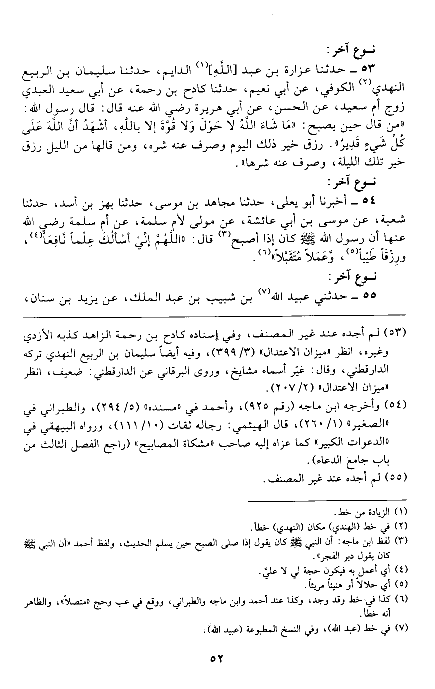 54 - أَخْبَرَنَا أَبُو يَعْلَى، حَدَّثَنَا مُجَاهِدُ بْنُ مُوسَى، حَدَّثَنَا بَهْزُ بْنُ أَسَدٍ، حَدَّثَنَا شُعْبَةُ، عَنْ مُوسَى بْنِ أَبِي عَائِشَةَ، عَنْ مَوْلًى لِأُمِّ سَلَمَةَ، عَنْ أُمِّ سَلَمَةَ، رَضِيَ اللَّهُ عَنْهَا أَنَّ رَسُولَ اللَّهِ صَلَّى اللهُ عَلَيْهِ وَسَلَّمَ كَانَ §إِذَا أَصْبَحَ قَالَ: «اللَّهُمَّ إِنِّي أَسْأَلُكَ عِلْمًا نَافِعًا، وَرِزْقًا طَيِّبًا، وَعَمَلًا مُتَقَبَّلًا»