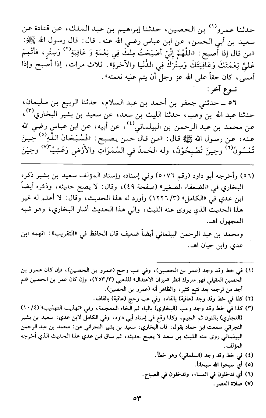 56 - حَدَّثَنِي جَعْفَرُ بْنُ أَحْمَدَ بْنِ عَبْدِ السَّلَامِ، حَدَّثَنَا الرَّبِيعُ بْنُ سُلَيْمَانَ، حَدَّثَنَا عَبْدُ اللَّهِ بْنُ وَهْبٍ، حَدَّثَنَا اللَّيْثُ بْنُ سَعْدٍ، عَنْ سَعِيدِ بْنِ بَشِيرٍ النَّجَّارِيِّ، عَنْ مُحَمَّدِ بْنِ عَبْدِ الرَّحْمَنِ بْنِ الْبَيْلَمَانِيِّ، عَنْ أَبِيهِ، عَنِ ابْنِ عَبَّاسٍ، رَضِيَ اللَّهُ عَنْهُمَا، أَنَّ رَسُولَ اللَّهِ صَلَّى اللهُ عَلَيْهِ وَسَلَّمَ قَالَ: " §مَنْ قَالَ حِينَ يُصْبِحُ -[54]-: {فَسُبْحَانَ اللَّهِ حِينَ تُمْسُونَ وَحِينَ تُصْبِحُونَ، وَلَهُ الْحَمْدُ فِي السَّمَوَاتِ وَالْأَرْضِ وَعَشِيًّا وَحِينَ تُظْهِرُونَ} الْآيَاتُ كُلُّهَا، أَدْرَكَ مَا فَاتَهُ فِي يَوْمِهِ ذَلِكَ، وَمَنْ قَالَهَا حِينَ يُمْسِي أَدْرَكَ مَا فَاتَهُ فِي لَيْلَتِهِ "