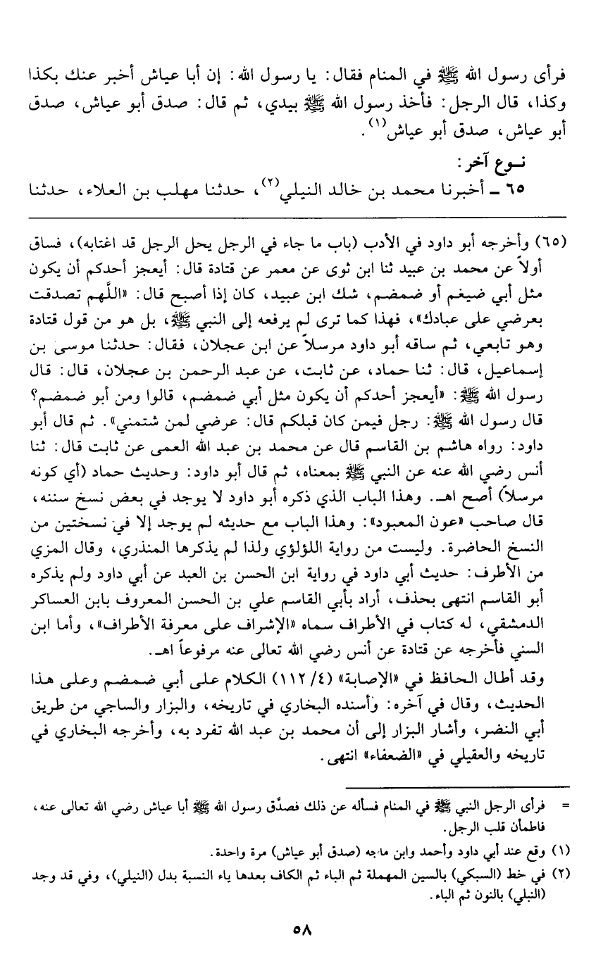 64 - حَدَّثَنَا يُونُسُ بْنُ الْفَضْلِ الطَّيَالِسِيُّ، حَدَّثَنَا يُونُسُ بْنُ عَبْدِ الْأَعْلَى، حَدَّثَنَا ابْنُ وَهْبٍ، حَدَّثَنَا عَمْرُو بْنُ الْحَارِثِ، عَنْ سَعِيدِ بْنِ -[59]- أَبِي هِلَالٍ، عَنْ أَبِي صَالِحٍ السَّمَّانِ، أَنَّ أَبَا عَيَّاشٍ، رَضِيَ اللَّهُ عَنْهُ كَانَ يَقُولُ: قَالَ رَسُولُ اللَّهِ صَلَّى اللهُ عَلَيْهِ وَسَلَّمَ: " §مَنْ قَالَ حِينَ يُصْبِحُ: لَا إِلَهَ إِلَّا اللَّهُ، وَحْدَهُ لَا شَرِيكَ لَهُ، لَهُ الْمُلْكُ وَلَهُ الْحَمْدُ، يُحْيِي وَيُمِيتُ، وَهُوَ حَيُّ لَا يَمُوتُ، وَهُوَ عَلَى كُلِّ شَيْءٍ قَدِيرٌ، كُتِبَ لَهُ بِهِنَّ عَشْرُ حَسَنَاتٍ، وَمُحِيَ عَنْهُ عَشْرُ سَيِّئَاتٍ، وَكُنَّ كَعَشْرِ رِقَابٍ، وَكُنَّ حِرْزًا لَهُ فِي يَوْمِهِ حَتَّى يُمْسِيَ، وَمَنْ قَالَ حِينَ يُمْسِي مِثْلَ ذَلِكَ حَتَّى يُصْبِحَ " فَكَأَنَّ رَجُلًا اتَّهَمَهُ، فَقَالَ: أَكْثَرَ أَبُو عَيَّاشٍ عَلَى نَفْسِهِ. فَنَامَ الرَّجُلُ، فَرَأَى رَسُولَ اللَّهِ صَلَّى اللهُ عَلَيْهِ وَسَلَّمَ فِي الْمَنَامِ، فَقَالَ: يَا رَسُولَ اللَّهِ، إِنَّ أَبَا عَيَّاشٍ أَخْبَرَ عَنْكَ بِكَذَا وَكَذَا؟ قَالَ الرَّجُلُ: فَأَخَذَ رَسُولُ اللَّهِ صَلَّى اللهُ عَلَيْهِ وَسَلَّمَ بِيَدِي، ثُمَّ قَالَ: «صَدَقَ أَبُو عَيَّاشٍ، صَدَقَ أَبُو عَيَّاشٍ، صَدَقَ أَبُو عَيَّاشٍ»
